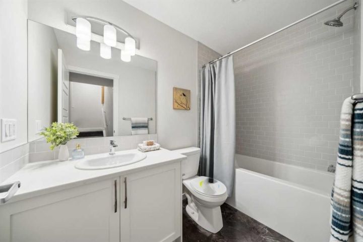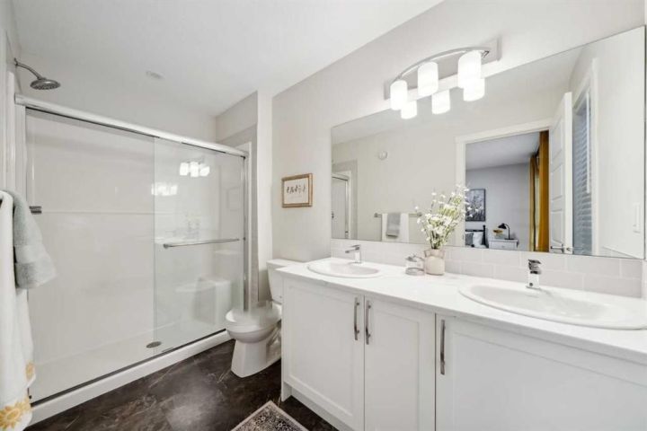 3-Bed, 2.5-Bath Townhome in Hudson, Greystone – 1,434 sq. ft. Welcome to Hudson in ZEN Greystone, a vibrant and walkable community in the heart of Cochrane. This beautifully designed 3-bedroom, 2.5-bath townhome offers 1,434 sq. ft. of modern living with NO CONDO FEES! The open-concept main floor features a spacious kitchen with stainless steel appliances, quartz countertops, and a large island that flows into the dining and living areas — perfect for entertaining or relaxing with family. Upstairs, the primary bedroom includes a walk-in closet and an ensuite with a double vanity, while two additional bedrooms, a full bath, and upper-floor laundry add everyday convenience. Additional highlights include a fenced backyard, rear parking pad, and full-size basement with optional development for added living space or storage. Located close to pathways, parks, tennis courts, Cochrane Pickleball Club, SLS Centre, off-leash dog park, Co-op, Bow RiversEdge Campground, and Downtown Cochrane!