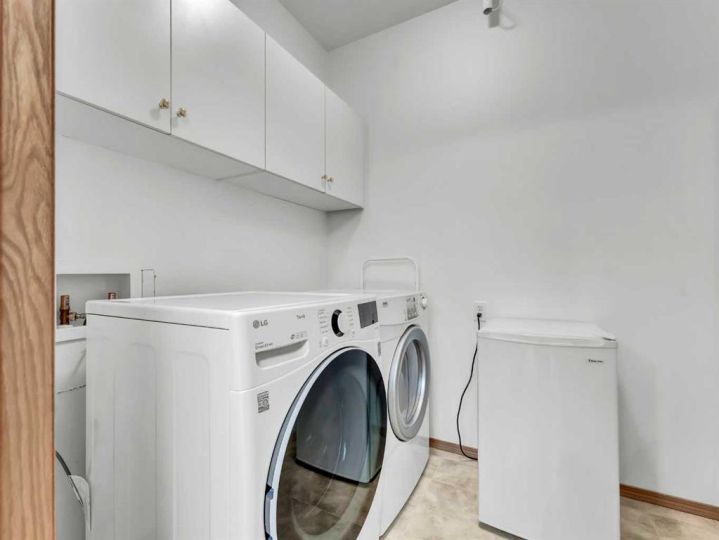 Fridge, Stove, Dishwasher, Washer, Dryer, Window Coverings, Ceiling Fans, Combined Furnace/Central Air unit. Also tall storage cupboard, small fridge & freezer in laundry room.