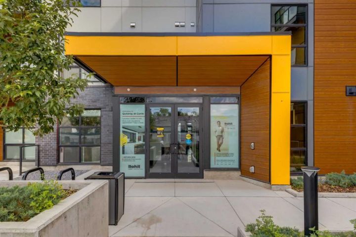 Discover the "Argento" floorplan by award-winning Rohit Homes—a bright and spacious 2-bedroom, 2-bathroom corner unit thoughtfully designed for comfort and style. Perfectly situated on the 5th floor of Quesnay at Currie Barracks, this home boasts soaring 9’ ceilings that create an airy, open feel while large windows fill the space with natural light. Featuring the bold and stylish Haute Contemporary color palette, the interior showcases a modern edge with sleek finishes and striking contrasts. The Argento offers high-end details throughout, including quartz countertops with a waterfall edge, a matching quartz backsplash, full-height cabinetry, a premium appliance package, bespoke light fixtures, and designer window coverings. The open-concept layout flows seamlessly between the kitchen, dining, and living areas, ideal for entertaining or simply enjoying everyday life. The primary suite includes a private ensuite for a touch of luxury, while the second bedroom and additional full bath provide comfort and flexibility for guests or a home office. Step outside to your ground-floor patio, extending your living space and offering a convenient connection to the outdoors. This pet-friendly and AIRBNB-approved building includes titled heated underground parking and plenty of visitor spaces. With its unbeatable location just minutes from downtown, Mount Royal University, and the vibrant communities of 17th Ave and Marda Loop, the Argento floorplan is perfect for downsizers or anyone looking for a stylish, low-maintenance home. Limited units are available—don’t miss your chance to make this striking residence yours! **Photos are taken from existing building of the same models. Not of the exact unit **