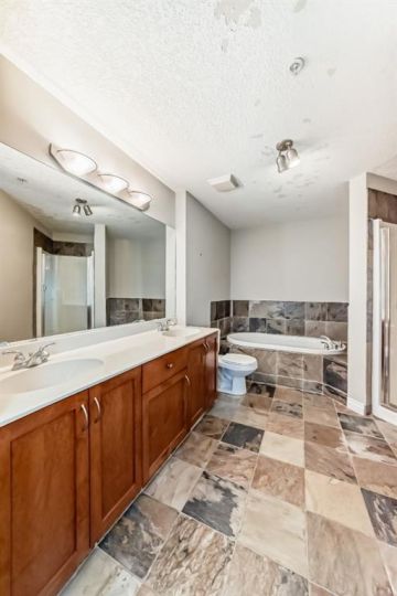 Main floor condo featuring two spacious primary suites! This ground-level unit offers exceptional accessibility with direct access from your private covered patio to the greenspace behind the building. Each primary bedroom includes its own luxurious 5-piece ensuite with a soaker tub and double sinks, making it ideal for guests or shared living. The open-concept kitchen features granite countertops, slate flooring, a breakfast bar, pantry, and stainless steel appliances, flowing seamlessly into the dining and living areas. A versatile flex room provides space for an office, den, or extra storage, while the laundry area is conveniently tucked into the powder room. Two titled underground heated parking stalls and an additional storage unit are included. Residents also enjoy access to fantastic amenities including a fitness center, car wash bay, guest suite, and clubhouse. With Shaganappi Golf Course, the LRT, and Westbrook Shopping Centre just minutes away, this home offers the perfect mix of comfort, convenience, and maintenance-free living.