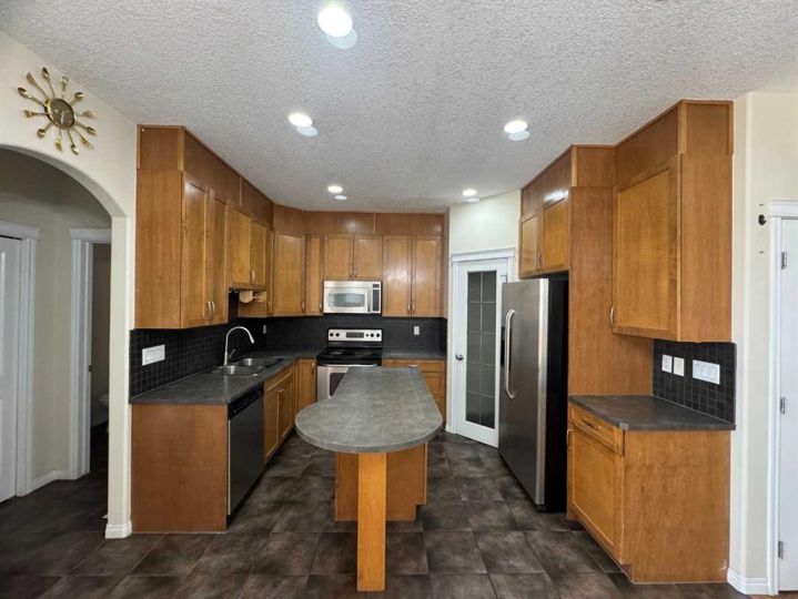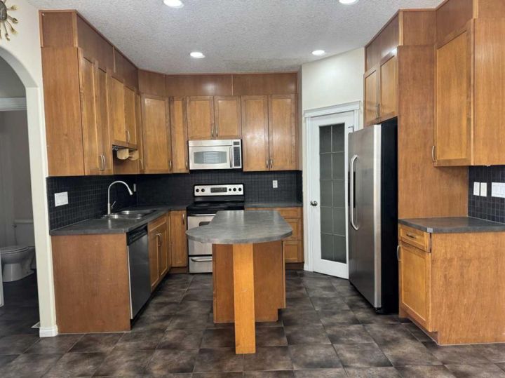 FORMER SHOW HOME | MOVE-IN READY | BASEMENT ILLEGAL SUITE WITH SEPARATE ENTRANCE! This stunning, fully finished property is perfect for your family. Flooded with natural light from the skylight and oversized windows throughout, this home welcomes you with a spacious entrance leading to a generous living room featuring hardwood floors, 9-foot ceilings, rounded corners, pot lights, ceramic tile, and a 3-way gas fireplace shared with the expansive dining area and kitchen. The gourmet kitchen boasts stainless steel appliances, upgraded lighting, a corner pantry, premium maple cabinets extending to the ceiling and a functional island ideal for meal prep and casual dining. A convenient 2-piece bathroom completes the main floor. Upstairs, the luxurious primary bedroom offers vaulted ceilings, a private balcony with breathtaking views, abundant windows, a walk-in closet and a full ensuite bathroom. Two additional well-sized bedrooms and a 4-piece bathroom round out the upper level. The basement illegal suite features a separate entrance with its own kitchen, in-suite laundry, one bedroom plus den and full bathroom. Recent upgrades include new roof, new eavestroughs, basement vinyl flooring, hot water tank(2021) and double garage(2022). The property sits on a large fenced lot with rear garage access. Don't miss this exceptional opportunity!
