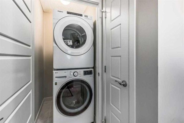 Dishwasher, Electric Range, Microwave Hood Fan, Refrigerator, Washer/Dryer Stacked