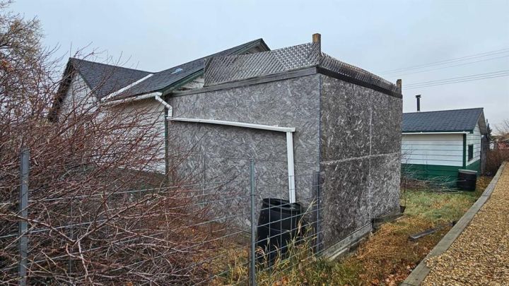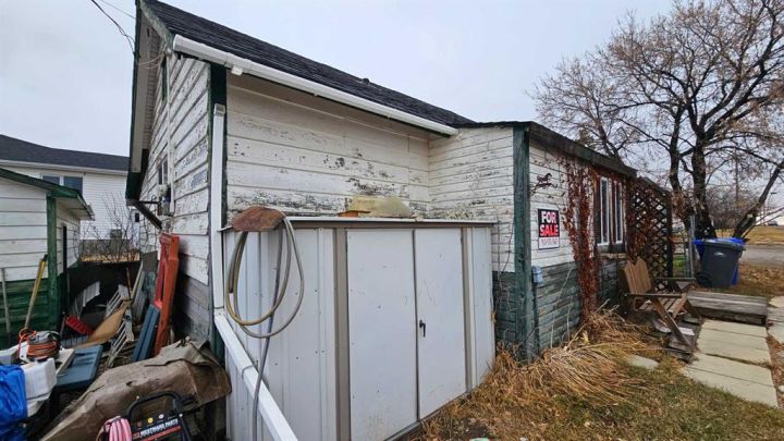 Cozy home on a corner lot with multiple sheds and a double detached garage, this 710 sq ft single bedroom with a newer window, along with an upgraded four piece bathroom, upgraded kitchen, main floor washer and dryer and has a comfortable living room with newer front window. A set of patio doors off the laundry area goes onto a deck that is surrounded by a windbreak to the west and north side. The interior has had some laminate flooring laid, but will need the rest of the house done. The outside is needing a good paint job, along with the sheds and garage. There is a partial basement that has a newer HE furnace and a newer on demand hot water system. There is a small cold porch to the east side . Shingles were done in approximate 2013 on the house.