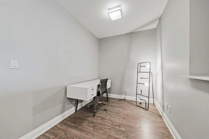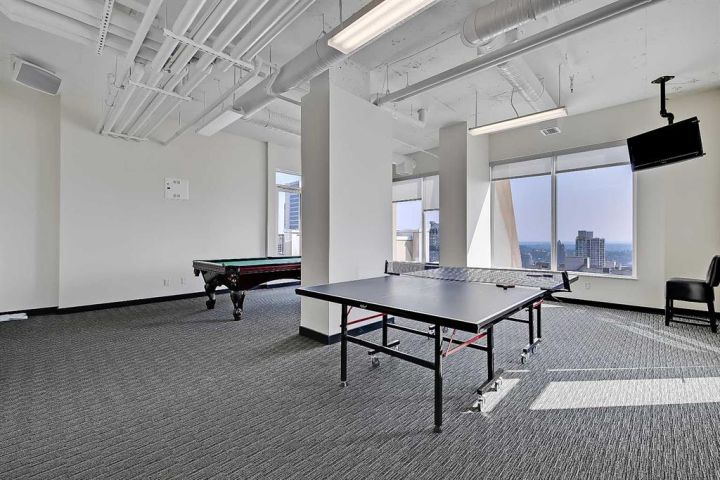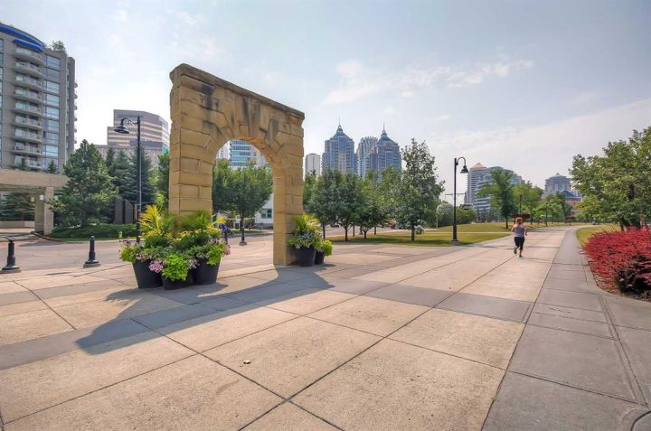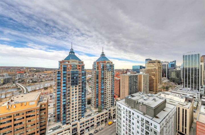 *VISIT MULTIMEDIA LINK FOR FULL DETAILS, INCLUDING IMMERSIVE 3D TOUR & FLOORPLANS!* This bright NORTH-facing 1-bed + den unit with stunning PANORAMIC RIVER VIEWS from the 24th floor in the upscale Vogue building is a must-see! There are only 4 upgraded floors in the Vogue building, which were specially customized for Bedouin Suites, and this is one of them! EXCLUSIVE BEDOUIN FEATURES include upgraded hallways and common areas, as well as INCREDIBLE UNIT UPGRADES like custom kitchen islands with bar seating, upgraded appliances & lighting including dimmers throughout, custom bedroom panelling including built-in side tables with convenience plugs, upgraded bathrooms with tile wainscoting and glass shower doors, built-in walnut entertainment units, a Smart Sensor energy management system for the eco-minded buyer and MORE! This customized ‘VARSITY’ floorplan also had a kitchen wall removed for improved flow and natural light, and WOW, does it look good! This condo presents modern living at its finest, including an open-concept layout filled with natural light through ample floor-to-ceiling windows, complemented by luxury vinyl plank flooring adorning the main living spaces. The modern kitchen boasts wood-grain cabinets with modern hardware and under-cabinet lighting, a specially designed central island with quartz counters, a tile backsplash, a dual-basin undermount sink, and upgraded stainless steel appliances, including a chimney-style hood fan. The open main living area features a built-in walnut entertainment unit with a wall-mount TV included and access to a large balcony with a gas line for a BBQ and panoramic views of the Bow River. The bedroom features custom wall panelling with built-in side tables, wall sconce lighting and a convenient receptacle with a USB port, plus an included wall-mounted TV. A large walkthrough closet with built-in organizers and a stacked laundry leads to the 4-pc bathroom complete with occupancy-sensored lights, quartz countertops, tile wainscoting, an undermount sink with modern faucet, tile backsplash, modern vanity with storage, tile floors, and a large tub/shower combo with full height tile and an upgraded glass door. Additionally, a sizable den makes the perfect home office or flexible space. VOGUE is a high-end building with a ton of amenities, including UNDERGROUND HEATED PARKING, central A/C, an elegant formal lobby, full-time concierge, gym, billiards, a large party room with a kitchen, a yoga studio, a Sky Lounge on the 36th floor, and multiple rooftop terraces. Surrounded by parks, transit, the LRT, shopping & more, & within walking distance to the downtown core & all Kensington shops & services – this location offers the best urban lifestyle in the Downtown Commercial Core.