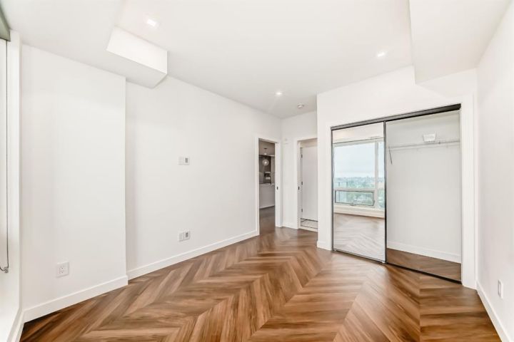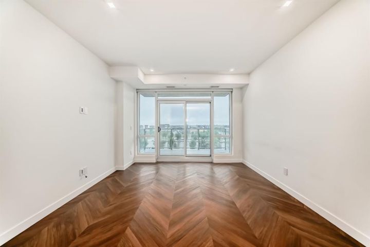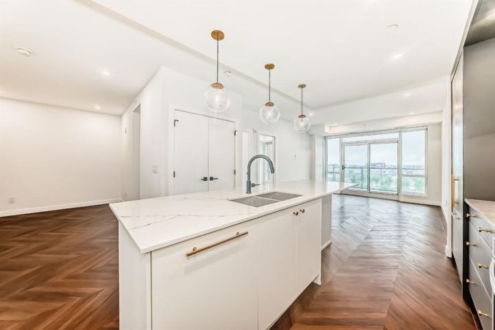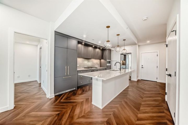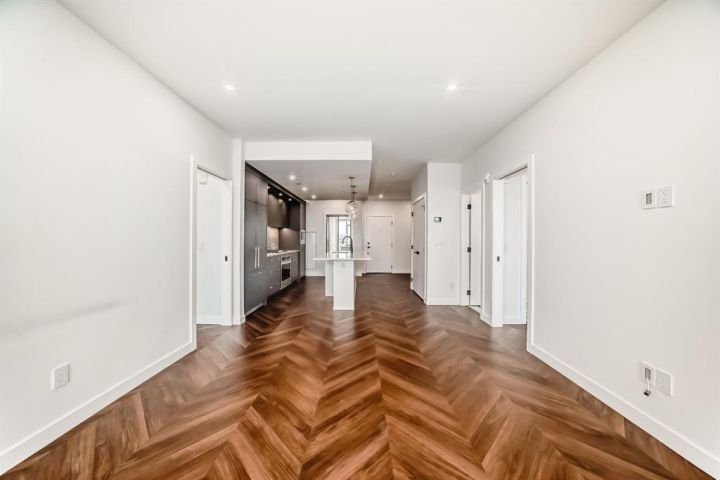 Step into this stunning 2-bedroom, 2-bathroom plus den condo that perfectly blends modern luxury with everyday comfort. Featuring 9-ft ceilings, floor-to-ceiling windows, and stylish herringbone flooring, this bright and open space includes a gourmet kitchen with quartz countertops, full-height soft-close cabinetry, LED lighting, and premium appliances. The spacious primary bedroom boasts a walk-in closet and a 4-piece ensuite, while the second bedroom is paired with a sleek 3-piece bath. Enjoy the convenience of in-suite laundry, a private balcony, and access to amenities like concierge service, a social lounge, bike storage, and vibrant ground-floor retailers. Located just 15 minutes from downtown and 5 minutes from WinSport, with easy access to major roads, this home offers the perfect balance of urban living and outdoor lifestyle.