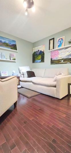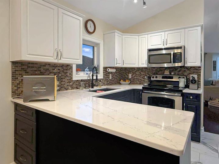 Welcome to this meticulously cared-for duplex in the desirable Hayden Ridge Estates — ready for its next owner to love just as much as the first. Built in 2011 and owned by the same meticulous owner since day one, this home has never been smoked in and shows true pride of ownership throughout. Located in the newest phase of Grande Cache (Phase 6), these sought-after units are known for their quality craftsmanship, low-maintenance lifestyle, and scenic surroundings. Enjoy breathtaking mountain views from both the front and back of the home. The main floor features hardwood flooring, a cozy gas fireplace, and a stylish kitchen complete with quartz countertops and ample cabinetry. A den on this level provides the perfect space for a home office or guest room, along with a four-piece bathroom nearby. The spacious primary suite includes a walk-in closet and a private three-piece ensuite. The fully developed walkout basement is finished with plush carpet and offers a generous recreation area, two well-sized bedrooms, a four-piece bathroom, and a utility/storage room. Recent updates add even more value and comfort, including a new washer and dryer installed in 2025, new kitchen and bathroom flooring in 2025, a new hot water tank in 2024, and a fresh coat of paint throughout in 2024. Additional features include a 20x22 attached garage with direct access to the home, offering both convenience and extra storage. With the trail system just steps from your door, this location is perfect for nature lovers and outdoor enthusiasts. Condo fees include exterior maintenance, snow removal, lawn care, property management, and outside insurance, leaving only utilities to be covered by the homeowner.