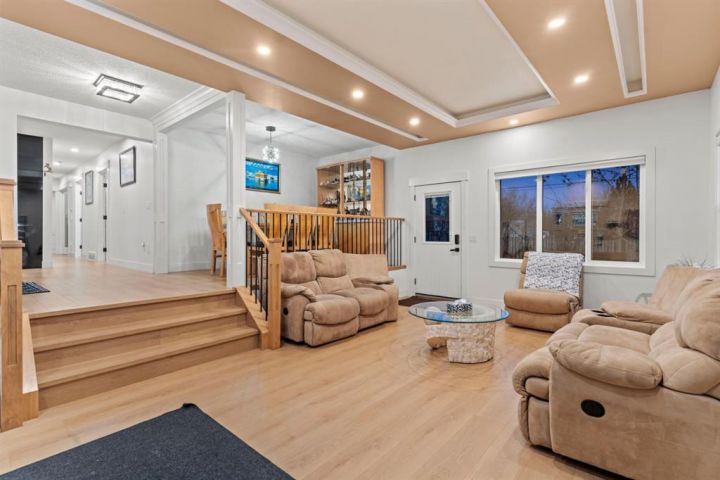 Welcome to an extensively renovated bungalow set on a large, private piece of land in the peaceful, rural-feeling pocket of Shepard, yet only minutes from Calgary’s major routes and city conveniences. This home offers 3,380 sqft of total living space, open layout that combines generous principal rooms with modern design. The main level features a huge fully updated kitchen with oversized quartz island, sleek cabinetry, high-end appliances, and panoramic windows that bring in beautiful evening light. Multiple living and family spaces provide ideal separation for large families, highlighted by a raised dining area overlooking the main living room and offering a warm, inviting flow for gatherings. The main floor also includes three bedrooms plus an office, along with two renovated ensuites and a full bathroom. The lower level is equally impressive, offering a spacious secondary living area complete with an illegal basement suite, a massive rec room, three additional bedrooms, two full bathrooms including another ensuite, laundry space, and ample storage. Outside, the property features a wide driveway, a detached heated garage, plenty of yard space for parking or future use, and a back deck off the kitchen area perfect for enjoying the open surroundings. This is a rare opportunity to own a move-in-ready, fully modernized home on substantial land within Calgary city limits, offering space, comfort, and versatility for multi-generational living or future potential.