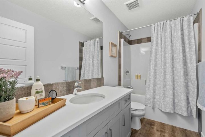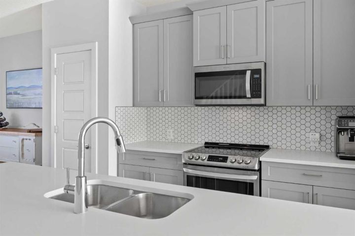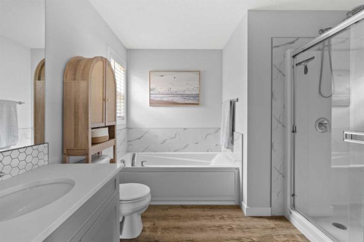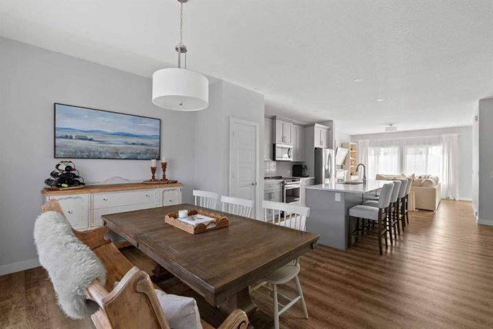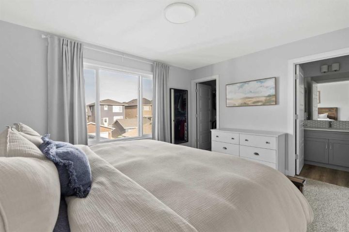 **OPEN HOUSE - SATURDAY, NOVEMBER 22nd FROM 1:00-3:00!** A pristine original-owner home in the heart of Chelsea, Chestermere - showcasing true pride of ownership and presenting as close to new as it gets. With nearly 1,650 sq. ft. of thoughtfully designed living space, this is the ideal family home offering 3 bedrooms, 2.5 bathrooms, a fully landscaped yard, a private double detached garage, and an undeveloped basement with rough-ins ready for your future vision. The open-concept main level is anchored by a stunning central kitchen, creating the perfect flow for both everyday living and entertaining. Finished with timeless light grey shaker cabinetry, an oversized quartz island, and a full suite of upgraded stainless-steel appliances, this kitchen is as functional as it is beautiful. A south-facing front great room is bathed in natural light through a wall of windows, while the expansive ~14' x 10' dining area at the rear comfortably accommodates any dining setup and overlooks the private backyard. A convenient powder room and large closets at both the front and back entrances complete the main level. On the upper level, the impressive ~14' x 12' primary suite easily fits a king-sized bed and additional furniture. It’s complete with a luxurious 5-piece ensuite featuring dual sinks, a soaker tub, a walk-in shower, and a generous walk-in closet with space for two. Two comfortable secondary bedrooms sit at the opposite end of the home, separated by a large main bathroom and an upper-level laundry room - an ideal layout for privacy and practicality. Outside, the property is fully landscaped, fenced, and completely move-in ready - saving you the time and cost typically associated with new construction. Enjoy multiple outdoor living spaces, including a charming full-width covered front porch to capture the south sun, and a large rear deck with gas line and pergola overlooking the private yard. The double detached garage provides secure parking and extra storage year-round - an especially appreciated benefit during the winter. Perfectly positioned within walking distance to parks, schools, and local amenities, while still only a quick drive to Calgary, this home delivers convenience, comfort, and exceptional value in the vibrant community of Chelsea in Chestermere. A truly move-in-ready home that combines thoughtful design, modern finishes, and unbeatable location - this is one you won’t want to miss.