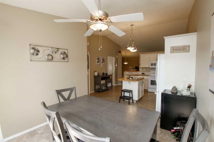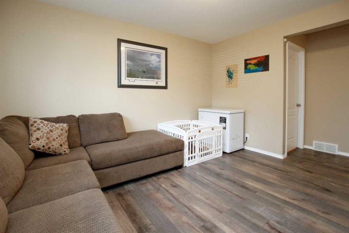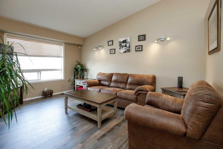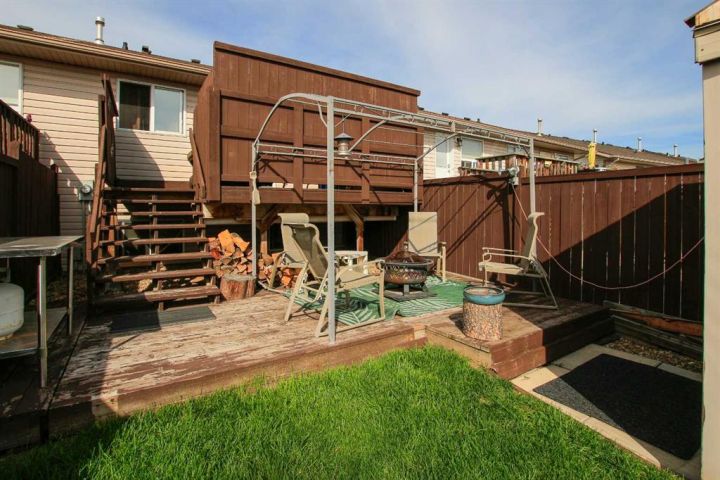 FULLY DEVELOPED TOWNHOME ~ 3 BEDROOM, 2 BATH TOWNHOME ~ FENCED BACKYARD W/REAR PARKING PAD ~ NO CONDO FEES ~ Pride of ownership is evident in this well cared for home with updated flooring and paint ~ Covered front entry welcomes you and leads to a sun filled foyer ~ Vaulted ceilings create a feeling of spaciousness ~ The living room features a west facing picture window that overlooks the front yard and allows for natural light to fill the space ~ The kitchen offers a functional layout with plenty of white cabinets, ample counter space including an island with an eating bar and opens to the dining room with garden door access to the deck and backyard ~ The primary bedroom can easily accommodate a king size bed, has ample closet space and is conveniently located next to the 4 piece main bathroom ~ The fully finished basement has large above grade windows and operational in floor heat and offers a generous size family room, 2 bedrooms, a 4 piece bathroom, laundry and space for storage ~ The backyard offers an upper deck with privacy panels and space for storage below, lower deck, a garden shed, and is fully fenced with access to the rear parking pad and paved alley ~ Located in a quiet crescent with easy access to schools, parks, playgrounds, walking trails, shopping, transit and highway access.