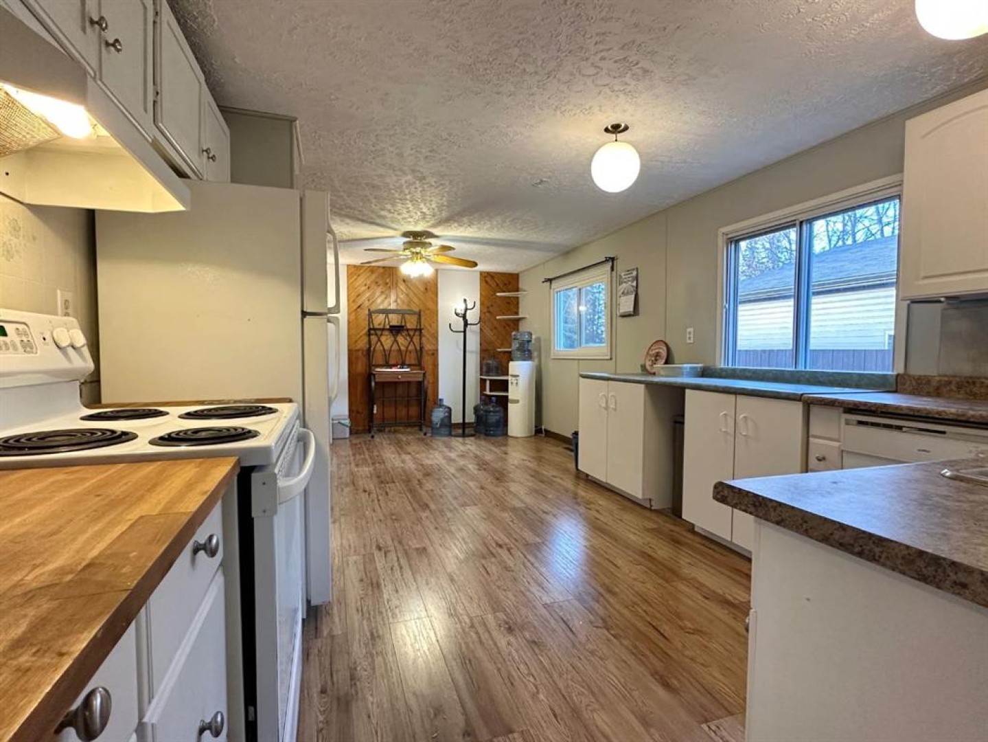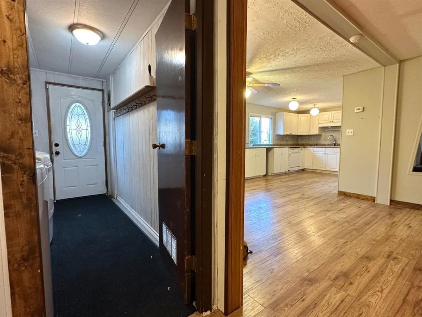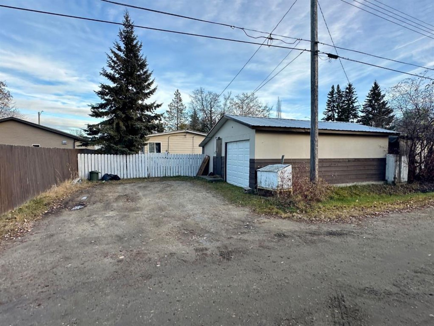 The side entrance provides an unheated space perfect for storing gear or serving as a mudroom to hang jackets. This home offers 3 comfortable bedrooms and 2 full baths. Step on in and you'll find the living room that flows into the dining area, featuring a cozy pellet stove for supplemental heat and ambiance during the colder months. The kitchen comes complete with all appliances and more room for a breakfast table. While the bedrooms offer plenty of storage, including a walk-in closet in the primary bedroom with a 3 piece ensuite. The walk-through laundry room also acts as a convenient back entry. Some updates such as the metal roof is approximately 10 years old, the hot water tank is about 5 years old, and the furnace was replaced around 2008. Out back, you'll appreciate the fenced yard with mature trees, along with the 16' x 24' detached garage accessed from the back alley, making parking a breeze. The home currently sits on wood blocks, and with possession available in December, you can be settled before winter truly hits. Come take a look and make this home yours!