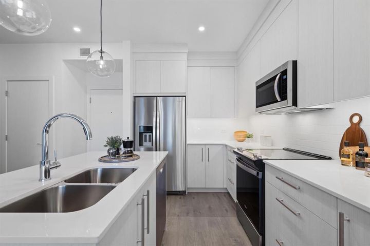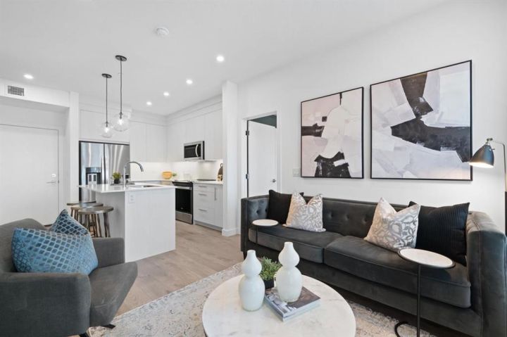 Welcome to Lockwood, where comfort meets convenience in this stunning 2-bedroom, 2-bathroom unit with a titled parking stall, located in the vibrant and fast-growing community of Chelsea in Chestermere. Surrounded by parks, playgrounds, and scenic walking trails—and just moments from Chestermere Lake—this home is perfectly positioned for both relaxation and adventure. Enjoy easy access to local amenities like Chestermere Station, Chestermere Crossing, and an array of shopping and dining options, all just minutes away. Step inside to experience a thoughtfully designed open-concept layout featuring an oversized south-facing balcony that floods the living space with natural light and offers serene views—perfect for outdoor dining or relaxing in the sun. Every detail has been carefully curated, from the luxurious vinyl plank flooring and soaring ceilings, to the chef-inspired kitchen complete with full-height soft-close cabinetry, sleek stainless steel appliances, a pantry, and an elegant eat-up bar topped with quartz countertops—ideal for casual meals and entertaining. The primary bedroom, features a generous walk-through closet and a private 3-piece ensuite. A second bedroom, perfect for guests or a home office, and a stylish 4-piece main bathroom complete the space. Beyond your private residence, enjoy a wealth of on-site amenities including a fully equipped fitness centre, owners’ lounge, bike storage, and more—all designed to complement an active and social lifestyle. This bright and modern home is move-in ready, offering a premium opportunity to embrace the TRUMAN lifestyle in one of Chestermere’s most exciting new communities. *Photos shown are of a similar unit