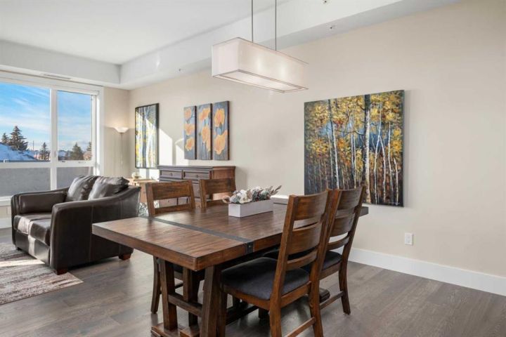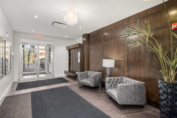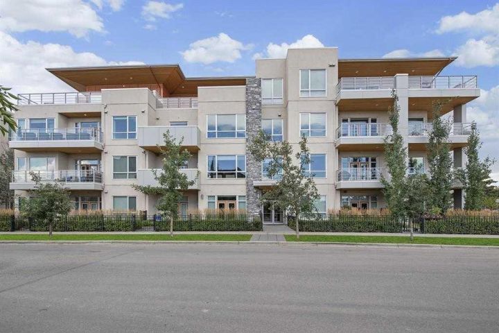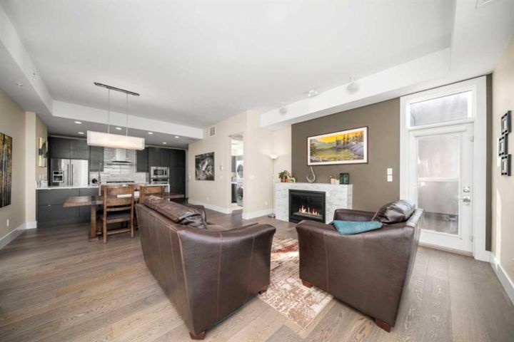 Welcome to luxury single-level living in the heart of CURRIE BARRACKS. This oversized 1-BEDROOM residence combines upscale design, lock-and-leave convenience and executive comfort, all set within one of Calgary’s most beautifully planned inner-city communities. Ten-foot FLAT PAINTED CEILINGS and SOUTH EXPOSURE create a bright backdrop for refined everyday living. The CHEF’S KITCHEN anchors the home with an OVERSIZED QUARTZ WATERFALL ISLAND, WOOD DOVETAIL CABINETRY, a full KITCHENAID APPLIANCE PACKAGE including GAS COOKTOP, WALL OVEN and BUILT-IN MICROWAVE, and clear sightlines to the main living and dining areas for effortless entertaining. The spacious DINING AREA easily hosts full-sized furnishings, a rarity in condo living, while the LIVING ROOM features a GAS FIREPLACE with TV WIRING ABOVE and CEILING SPEAKERS for an elevated media experience. Wide-plank ENGINEERED HARDWOOD FLOORING, 8’ SOLID CORE DOORS, LED LIGHTING and HUNTER DOUGLAS WINDOW COVERINGS reinforce the high-end feel throughout. The PRIVATE FOYER, generous LAUNDRY ROOM with custom storage, and SMART HOME READY infrastructure for lighting, audio and security add executive-level convenience. The PRIMARY BEDROOM offers a COFFERED CEILING, TWO CLOSETS INCLUDING ONE WALK-IN with professional organizers and a spa-inspired ENSUITE with FREE-STANDING TUB, OVERSIZED GLASS SHOWER and designer layout. Enjoy morning sun and evening light from the large PRIVATE BALCONY accessed from both the living room and bedroom, complete with BBQ GAS LINE for year-round grilling. CENTRAL AC ensures comfort in every season, while the secure, HEATED UNDERGROUND PARKADE includes a titled stall in a premier location for easy access. The building itself is exceptionally maintained, PET FRIENDLY WITH BOARD APPROVAL, and designed with enhanced security features for peace of mind. CURRIE BARRACKS offers walkable access to the OFF-LEASH DOG PARK, AIRPORT PLAYGROUND, the current retail corridor along Richardson Way, and is minutes from MOUNT ROYAL UNIVERSITY, NORTH GLENMORE PARK, KILLARNEY RECREATION CENTRE, and downtown Calgary with excellent transit connectivity for an easy commute. For the buyer seeking elevated design without compromise on space, privacy or location, this home delivers a rare luxury experience within a boutique, executive-level building.