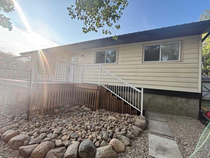 Welcome to this beautifully updated 4-bedroom, 3-bathroom home with a walkout basement, ideally located in town yet offering exceptional privacy. Step inside to find stunning updated flooring throughout and a gorgeous modern kitchen featuring a large island—perfect for family gatherings and entertaining. The upper level offers a spacious primary bedroom with a 3-piece ensuite, plus two additional bedrooms and a 4-piece bathroom complete with a luxurious jetted tub. Downstairs, the walkout basement expands your living space with a bright rec room, cozy family room, a 3-piece bathroom, a fourth bedroom, and a versatile flex room ideal for an office, toy room, or home gym. A large utility/laundry room provides extra storage space for convenience. Enjoy your own private outdoor retreat with a fenced yard, deck for entertaining, and space for kids and pets to play safely. Recent upgrades include brand new carpet flooring downstairs, a new furnace, and a durable metal roof and gutters installed approximately 4-5 years ago. Additionally, a tarp shed and a garden shed are also included.