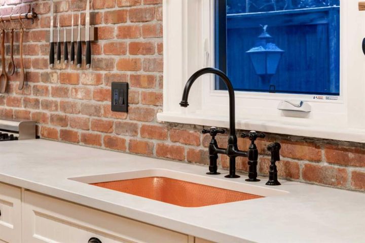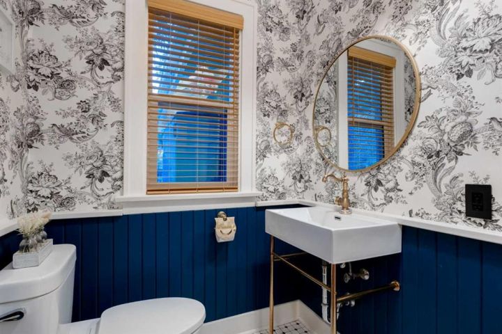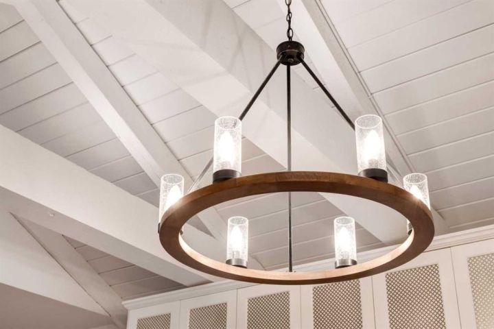 Rain chains, Blue cabinet in basement bathroom, Kitchen Island, Black hanging pot rack in kitchen, Solar lights, String lights.