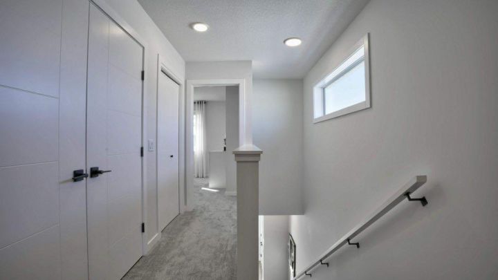 JANUARY COMPLETION * LUXURIOUS STREET TOWN * NO CONDO FEES * DOUBLE CAR GARAGE * FULLY LANDSCAPED * DECK * WINDOW COVERINGS * UPGRADED FINISHINGS * Wonderful home located within a 5 minute walk to the Bow River where nature is right at your back door! As you enter this "open concept floor plan", the first features you'll see are the gorgeous wide plank floors, the 9 foot high ceilings, a cozy fireplace and elegant metal railing on the staircase. The spacious living room allows for casual family gatherings or a fun movie night. The dining room is located in the middle of the home and has the capacity to fit a large dining room table. The kitchen is at the REAR of the home and has an island with eating bar, a pantry, quartz countertops, Slim Line lighting and pendant lighting. The mudroom has a bench and hooks for jackets. The upper floor has a huge primary bedroom that has a walk in closet and a 4 piece ensuite bathroom which includes a 5 ft. wide TILED shower and 2 sinks. The 2 spare bedrooms are at the back of the home where you'll also find a 4 piece bathroom. The laundry room is on the upper floor as well. There's also a Tech space for a desk at the top of the stairs. The basement is undeveloped but can offer enough space for a future 4th bedroom, a 4th bathroom and a large recreation room. As you enter the backyard from the mudroom a 88 square foot deck is there to get your future backyard plans started. We have provided a R/I gas line for your BBQ here. To get you out of Calgary's long winters, a double car garage is waiting for you! Grass will be provided for both the front yard and the back. Energy saving components are triple pane windows, a 96% high efficient furnace, LED lighting, a high end Air Filtration System ( HRV ) and a ECOBEE SMART thermostat that's an "all in one Smart Device. There's a shallow concrete swale in the backyard for drainage. Pictures are representative. Not all components in the pictures are included. Pictures are of a showhome but not the exact home. Builder's representative will clarify all details prior to a contract being written. RMS measurements taken from Builder's blueprints.
