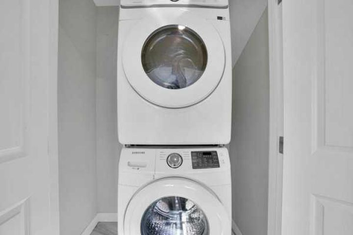 Dishwasher, Electric Range, Microwave Hood Fan, Refrigerator, Washer/Dryer Stacked