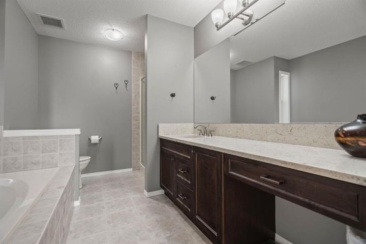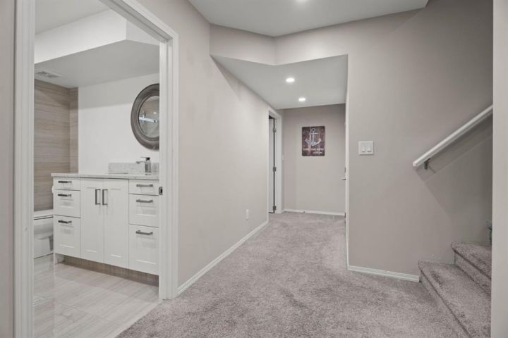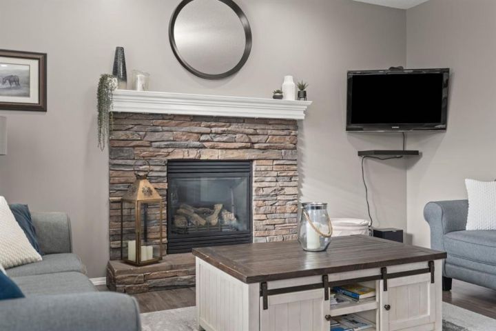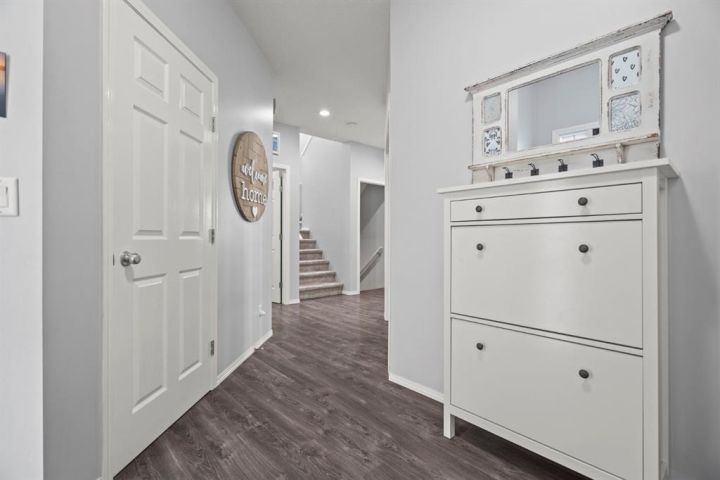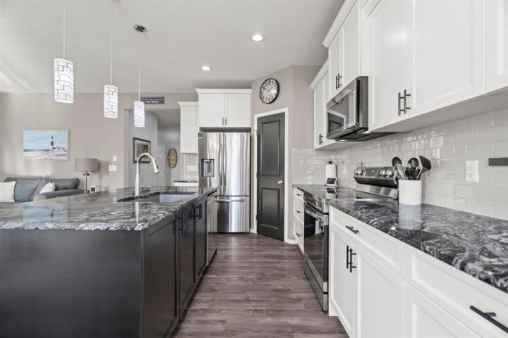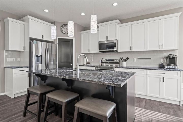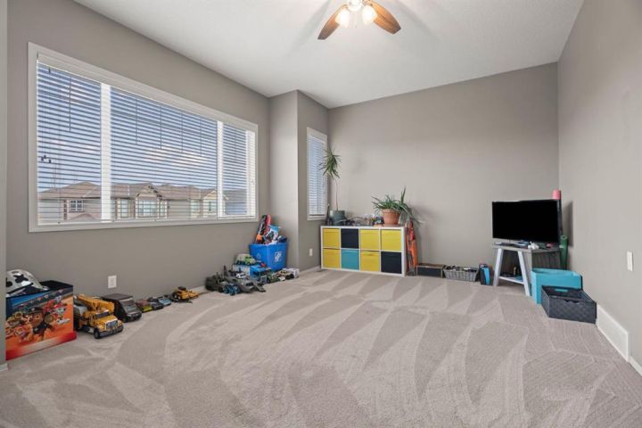 Welcome to this beautifully maintained 2-storey home in the highly sought-after community of New Brighton, offering over 3,090 sq ft of developed living space with 4 bedrooms, 3.5 bathrooms, a main-floor office, upper bonus room, and a fully finished basement. Thoughtfully designed with family living in mind, this home blends open-concept function with warm and inviting finishes throughout. The bright main floor features large windows and a spacious living room centered around a cozy gas fireplace. The well-appointed kitchen includes quartz countertops, a large island with seating, stainless steel appliances, subway tile backsplash, and a walk-in pantry, making it the perfect space for everyday cooking or entertaining. The dining area comfortably accommodates family gatherings and opens directly to the backyard for seamless indoor-outdoor living. Completing the main level is a private office with French doors, a 2-piece bathroom, and a mudroom off the garage that keeps busy routines organized. Upstairs, you’ll find a large bonus room ideal for movie nights or a play space, along with three generously sized bedrooms, including a spacious primary suite with a walk-in closet and 4-piece ensuite featuring a soaker tub and separate shower. The upper level also includes a full bathroom and a convenient laundry room with cabinetry. The fully developed basement expands your living space with a large recreation room, a beautiful wet bar with quartz counters, glass-front cabinets, sink, and beverage cooler, a fourth bedroom, and a stylish 3-piece bathroom with oversized tiled shower perfect for guests or teens. Outside, enjoy a large stamped concrete patio, built-in fire pit, play structure, and storage shed, all within a fully fenced and landscaped backyard ideal for outdoor entertaining and family fun. Located close to parks, pathways, schools, and the New Brighton Residents Association amenities, plus easy access to shopping, dining, South Health Campus, Deerfoot and Stoney Trail. The perfect place to call home!