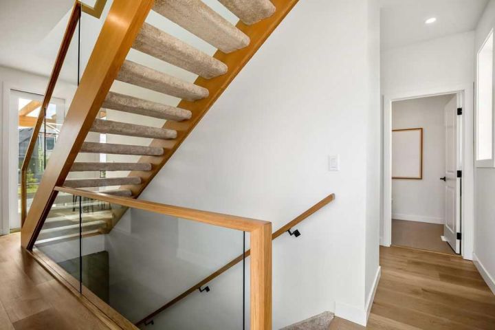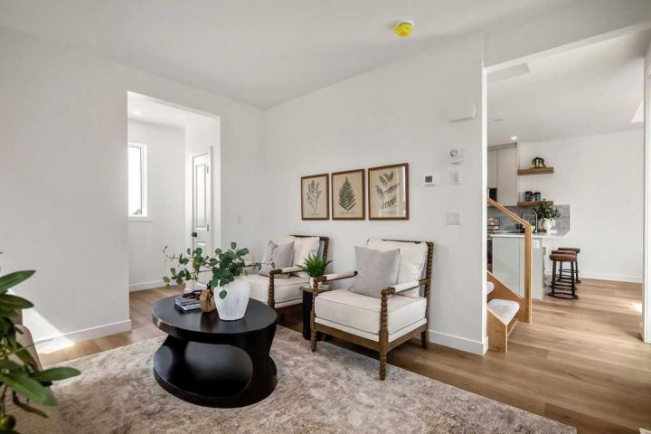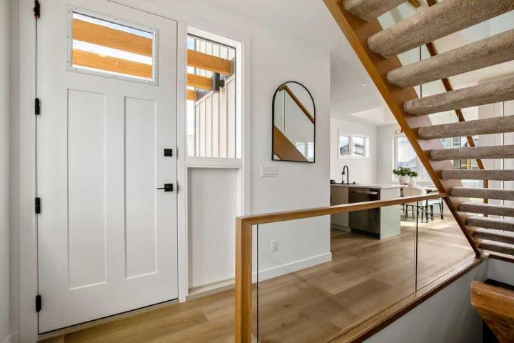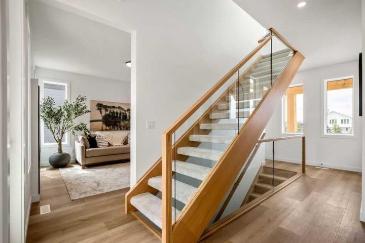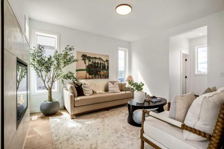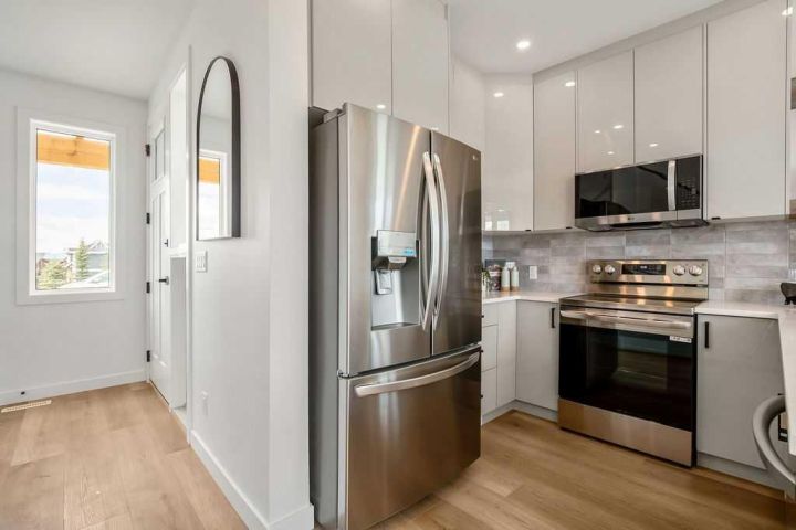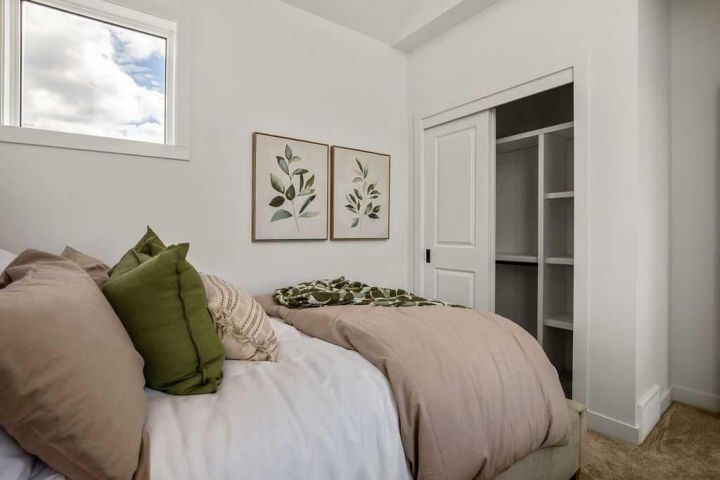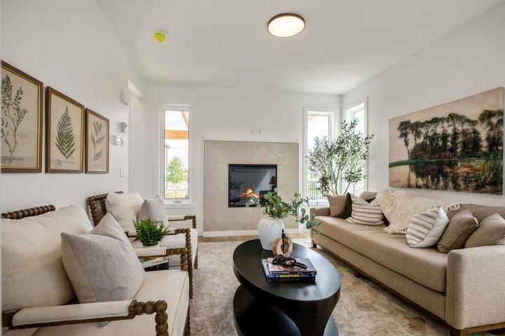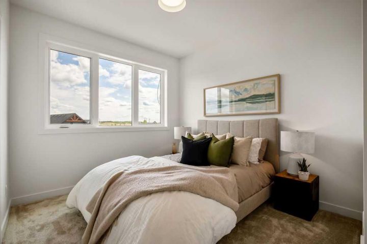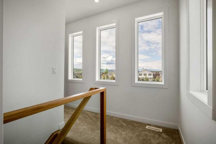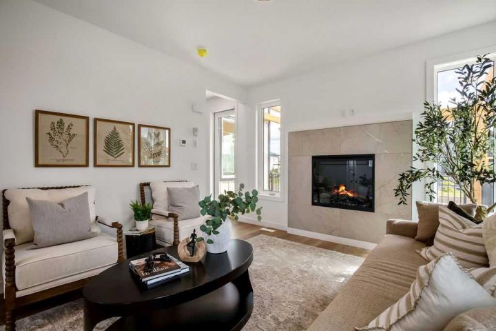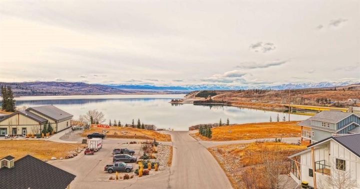 FORMER SHOWHOME! Crafted by a custom home builder, this new home showcases care and custom design throughout. Every inch of this 1,100 square foot developed home has been thoughtfully planned and executed, creatively utilizing every square inch. Main floor features a functional layout with half bath, living room, dining room and kitchen. Kitchen is an optimal u-shape offering ample cabinetry and counterspace. Overlooking the dining area which is upgraded with a tray ceiling and encased with oversized windows that flood the space with an abundance of natural light. Off the kitchen and dining area you will find the cozy living room with an upgraded Napoleon fireplace. This space offers direct access through an oversized doorway to the very large 17x12 deck. An exceptional place to spend summer evenings barbecuing and spending time with friends and family! The thoughtfully designed staircase with glass railing leads you to the upper level. Here you will find a large 4-piece bathroom with dual sinks, 2 bedrooms and a linen closet. Both bedrooms feature functional closets, with the primary bedroom spanning an impressive 100 square feet. The front bedroom is particularly unique, featuring a vaulted ceiling, mountain views captured through the oversized windows. In the basement you will find the laundry and a 550 sq ft unfinished space awaiting a custom touch. The space, and window size can accommodate an additional bedroom and also a bathroom (roughed in), plus living space. Making it a very functional and exceptional future value add to this home. Outside you can enjoy the sunny front West facing porch under the striking timber pergola. Exterior siding is a durable composite providing piece of mind. This home comes with front parking, a garage could still be added at an additional cost. No expense has been spared in using upgraded materials throughout the building process and in the finishing touches. Features include Duradek on the front and back decks, stone countertops, and upgraded plumbing and lighting fixtures throughout. Conveniently located around the corner from the main entrance of this gated community and within walking distance to the lake and recreation center, this property offers exceptional value at the listed price point. Residents can enjoy the community's incredible and unique amenities, such as an indoor pool, hot tub, fitness center, sandy beach, outdoor grill, playgrounds, numerous walking paths, and much more. Only 45 minutes from Calgary, and 10 minutes to the amenity rich town of Cochrane makes comfortable 4-season cottage living a reality. There are only 3 homes remaining that are ready for possession today!