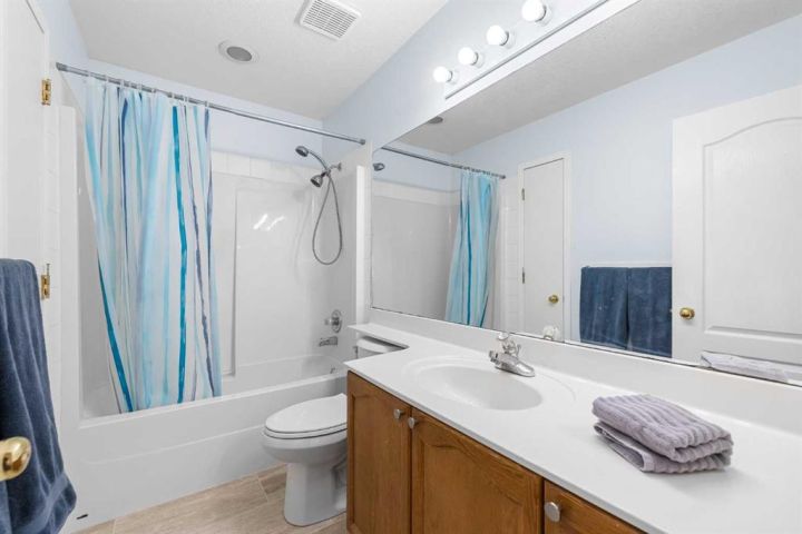 This spacious family home in the popular community of the Canals offers a wonderful layout, thoughtful updates and a generous backyard - all within walking distance of neighbourhood schools. Fully developed, with 5 bedrooms, 3.5 bathrooms and ample living space spread across three levels. The main floor has a welcoming front entry that leads to a private office framed by a large window overlooking the front yard. A formal dining room sits nearby and can be used to suit a variety of needs, whether hosting gatherings, or for day-to-day activities. The centrally located kitchen features abundant counter and cabinet space, island and corner pantry. The kitchen flows easily into the bright dining nook overlooking the backyard. From here, the space opens into the great room, where a stunning gas fireplace creates a warm focal point. Upstairs, the primary suite offers a comfortable retreat with a five-piece ensuite that includes a dual-sink vanity and a relaxing soaker tub, as well as a walk-in closet. Directly beside the primary bedroom is a den suited for reading, work, or quiet reflection. Three additional bedrooms and a four-piece bathroom complete the upper level. The fully finished basement extends the home’s versatility with an open recreation area, additional bedroom, bathroom and storage room. The attached double garage leads into a mudroom with closet and laundry area. Outside, the home sits on a large, pie-shaped private lot enriched with many mature trees, established garden spaces, and a charming tree house for children to enjoy! An impressive deck complete with a gazebo provides a sheltered outdoor spot for relaxing or entertaining through the seasons. Recent improvements include central A/C, fresh paint and new flooring, bringing a clean and updated feel throughout the home. The Canals community in Airdrie is known for its convenient pathways, numerous amenities and quick access to schools - making it a sought-after area for families. This home is perfectly located walking distance to Ralph McCall School, Our Lady of Peace School and C.W. Perry School. Take advantage of your opportunity to see this incredible property in person - book your showing today! Be sure to check out the floorplans and 3D tour for a closer look before your visit.