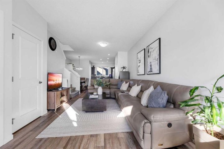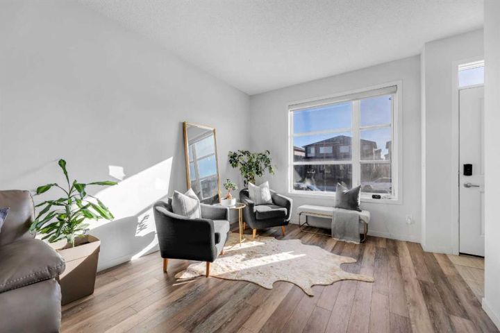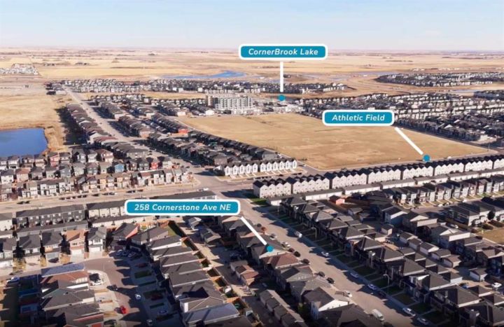 Wow! Steal of a Deal! Open House: November 22nd & 23rd: 1pm - 3pm. *Watch the video* . Gorgeous Home! A perfect blend of comfort, style, and value! A stunning property located in NE's Calgary one of the most popular and top selling community "Cornerstone". ALMOST 1600 SQFT | OVERSIZED DOUBLE GARAGE | SIDE ENTRANCE + 9FT BASEMENT | BRIGHT & OPEN FLOOR PLAN | 3 SPACIOUS BEDROOMS (ALL WITH WALK-IN CLOSETS) | MORRISON BUILT LOLA FLOOR PLAN | NEW ROOF SHINGLES & SIDING | BRAND NEW PAINT | NEWER APPLIANCES | FULLY LANDSCAPED & FENCED | 10/10 LOCATION. Step inside and you’ll immediately feel the warmth of the sun-filled south-facing open floor plan. The main level offers two versatile living spaces — a front great room and a cozy family area — ideal for family gatherings or entertaining. The spacious dining area comfortably fits a six-seater table and is surrounded by tall windows that fill the space with natural light. The chef’s kitchen features quartz countertops, a large center island, upgraded stainless-steel appliances (including a gas stove, new OTR microwave and newer fridge), and abundant cabinetry for all your storage needs. Upstairs fulfills what every growing family needs — three spacious bedrooms, each with its own walk-in closet, providing ample space and comfort for everyone. The primary bedroom offers a private ensuite and walk-in closet, while the two secondary bedrooms share a well-appointed bathroom. There’s even a bonus workspace nook — perfect for studying or working from home. Unfinished basement with a side entrance (with concrete steps) and 9ft ceiling - a great income potential to build a LEGAL SUITE (subject to approval and permitting by the city/municipality). Outside, enjoy your fully fenced and landscaped backyard, ideal for summer BBQs and get-togethers, along with a double detached garage for convenience. The backyard is already beautifully set up with a flower bed — a perfect spot to add your personal touch and grow your favorite flowers or plants Located steps from bus stops, parks, playgrounds, shops, restaurants, medical clinics, banks, and schools, plus minutes to FreshCo and other grocery stores, Stoney Trail, Deerfoot Trail, the airport, and the proposed Gurdwara site, this home delivers comfort, location, and value all in one package. Don’t miss your chance to own this beautiful move-in-ready home in Cornerstone.