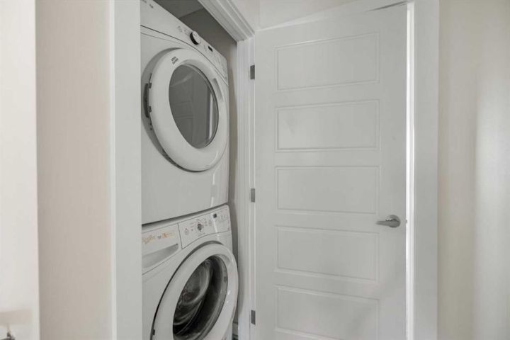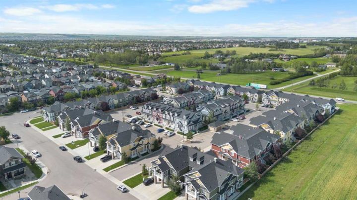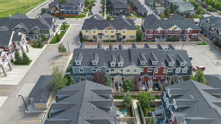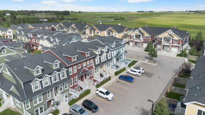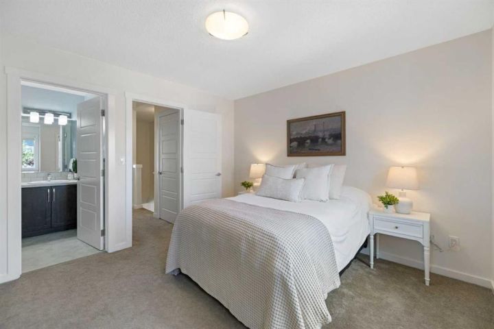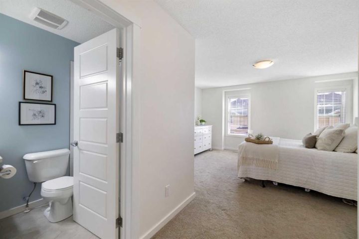 Hello, Gorgeous! Welcome to this beautifully maintained 2-bedroom, 2.5-bathroom townhome in the highly desirable Ravenswood community of Airdrie. Perfect for first-time buyers, downsizers, or investors, this home offers a functional layout, fresh upgrades, and a rare private backyard—ideal for both relaxing and entertaining. The bright, open-concept main floor flows seamlessly from the living area to the dining space and kitchen. The kitchen features a electric stove, dishwasher, and microwave hood fan, plus plenty of counter space for everyday cooking or hosting. A stylish half bath with statement wallpaper adds a touch of designer charm to the main level. Upstairs, you’ll find two spacious bedrooms, each with its own private en suite—now upgraded with beautiful new tile. Additional storage can be found in the attic with a pull down staircase providing access to this incredible storage space. Fresh paint throughout and new light fixtures bring a modern, move-in ready feel to the entire home. Step outside to enjoy your fenced backyard, perfect for BBQs, gardening, or unwinding at the end of the day. This property also includes a dedicated parking stall, washer and dryer, and window coverings. Located in a well-kept complex, Ravenswood offers quiet streets, access to parks and pathways, and close proximity to shopping, dining, schools, and commuter routes into Calgary. HOA fees include snow removal, landscaping, and insurance to the paint for true low-maintenance living. This move-in ready home blends comfort, style, and convenience—book your showing today!