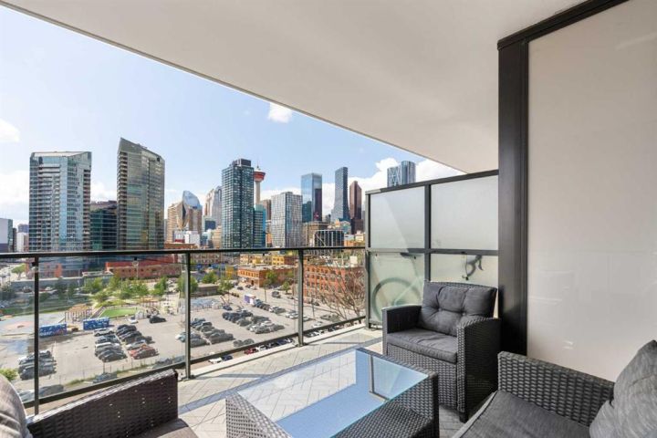 Enjoy upscale downtown living in this stylish 1-bedroom condo perched on the 8th floor of The Guardian, one of Calgary’s most recognizable residential towers. Showcasing west-facing skyline views through expansive floor-to-ceiling windows, this home blends contemporary design with functional comfort. The open-concept layout features a modern kitchen with a centre island, quartz countertops and sleek cabinetry, perfect for everything from quick meals to evening entertaining. The bright living room opens to a generous balcony, creating a seamless flow between indoor and outdoor space. The bedroom offers full-height windows, a walk-through closet and convenient access to the well-appointed 4-piece bathroom. Stay cool with central air conditioning, enjoy the ease of in-suite laundry, and benefit from titled underground parking. This secure, amenity-rich building includes 24-hour concierge service, a state-of-the-art fitness centre, yoga room, workshop, lounge with TVs and kitchen and a landscaped rooftop terrace with BBQs, fire tables, and panoramic views. Located in the heart of Calgary’s urban core, The Guardian puts you steps from the C-Train, Stampede Grounds, East Village, Repsol Centre, river pathways, and the restaurants, boutiques, and nightlife of 17th Avenue. Whether you're a professional, investor, or first-time buyer, this is your chance to own a sophisticated retreat in one of the city's most vibrant communities.