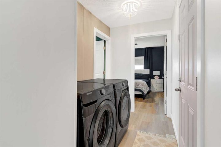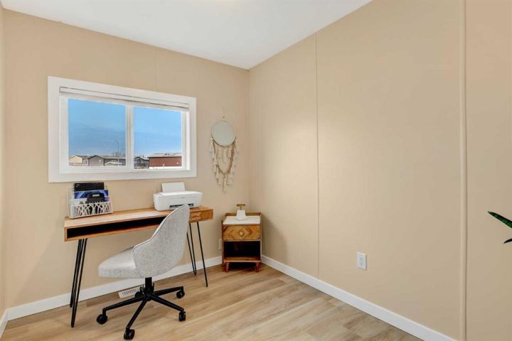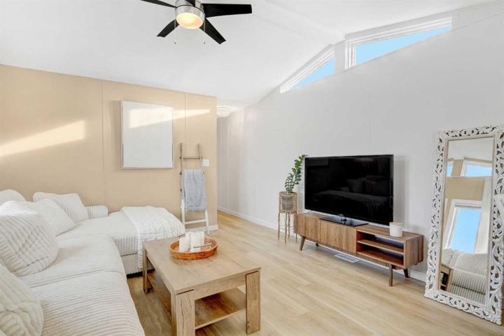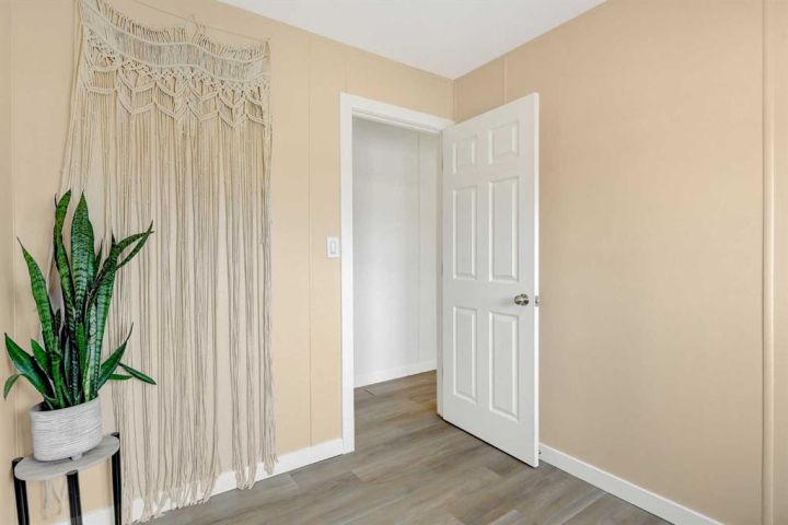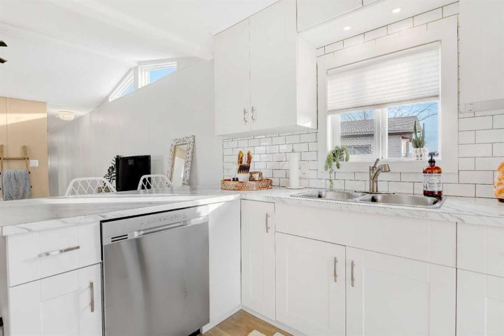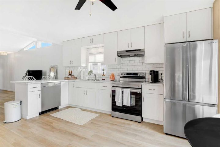 Beautifully renovated home in Trumpeter Village!! Gorgeous bright kitchen with big windows, crisp white cabinets, subway tile back splash and stainless appliances. Living room with vaulted ceilings, 3 bedrooms and 4 pc main bath. Vinyl plank flooring through out. The property includes a deck, shed and fenced in area. Lot rent is $584/month. Call today!