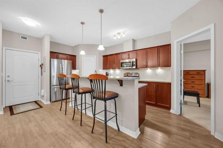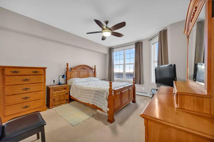 This spacious, top-floor South exposure unit features which gorgeous mountain views and premium finishes will not last long. It includes a gourmet kitchen with granite countertops, a huge island, stainless steel appliances and a pantry. The spacious primary bedroom has a walk through closet which leads to a well appointed 3-piece ensuite. The second bedroom also offers a walk through closet and a 4-piece ensuite which can also be accessed from the foyer. The unit is complete with a fantastic balcony with mountain and courtyard views and in suite laundry. Two titled underground parking spaces ensure that no one needs to park in the cold. Located on a quiet, no-thru road, this building is adjacent to the Crystal Ridge Golf Course and just a short walk to the Crystal Shores Beach House, offering year round recreation (swimming, boating, skating and fishing). Lake fees are included in the low monthly condo fees! Building amenities are extensive, featuring a gym, putting green, library, games room (with a pool table and dart board), offering plenty of opportunities for socialisation with your family, friends and neighbours. Book your showing today!