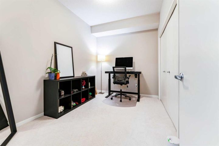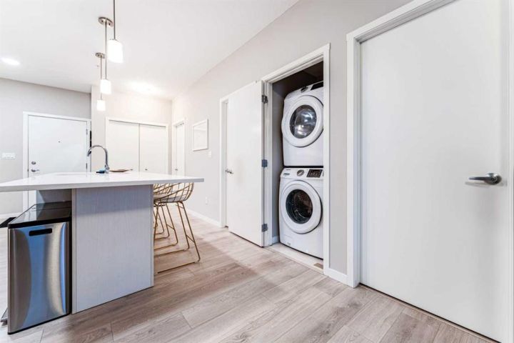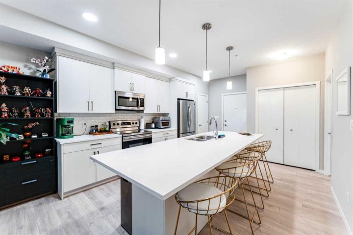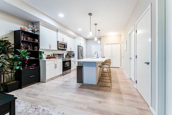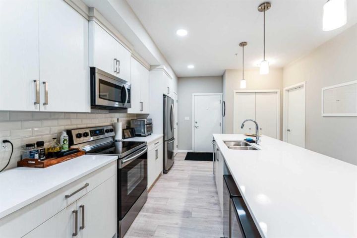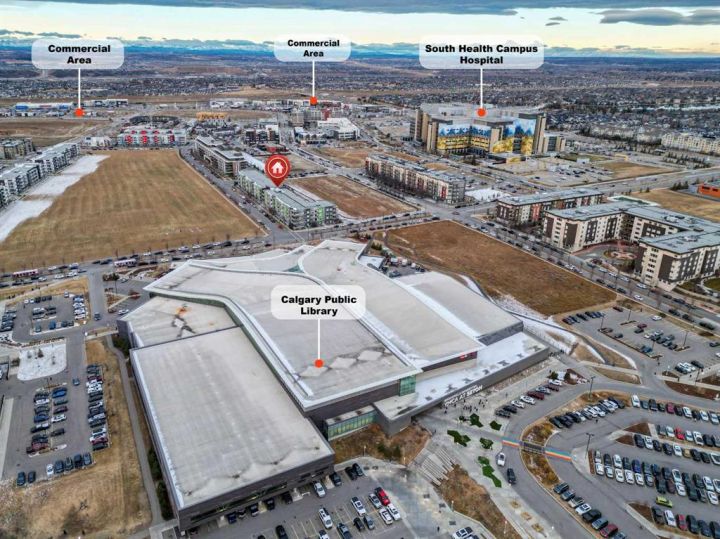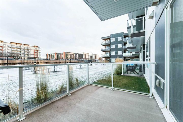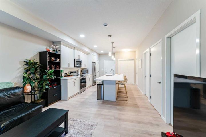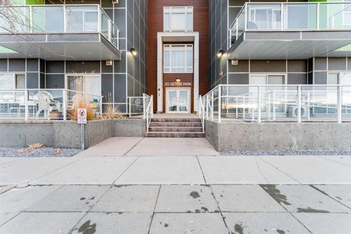 This bright, contemporary unit offers open-concept layout featuring oversized windows, a modern kitchen with a large island, quartz countertops, stainless steel appliances, pantry, and ample storage. The unit has a well sized primary bedroom, 4-piece bathroom, a second bedroom that provides versatility—ideal for families, guests, or as a home office/den. In unit laundry room, well sized balcony overlooking green space and title underground parking complete this condo. Exceptional location just steps from the YMCA, public library, and high school, and minutes to Seton’s shops, restaurants, movie theatre, and South Health Campus.