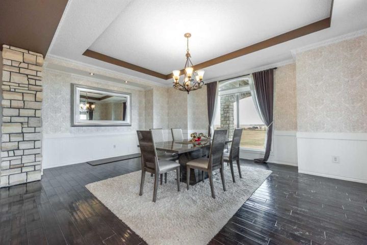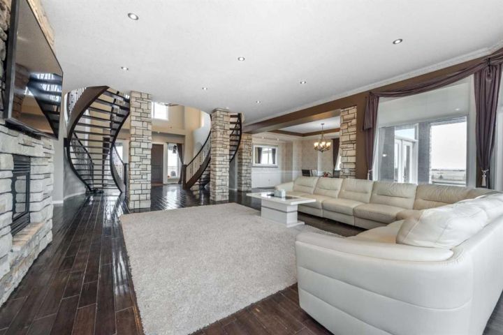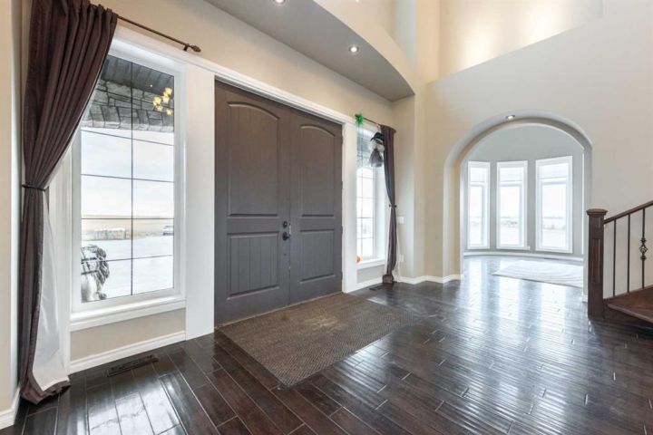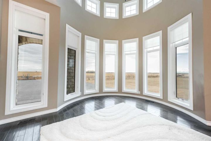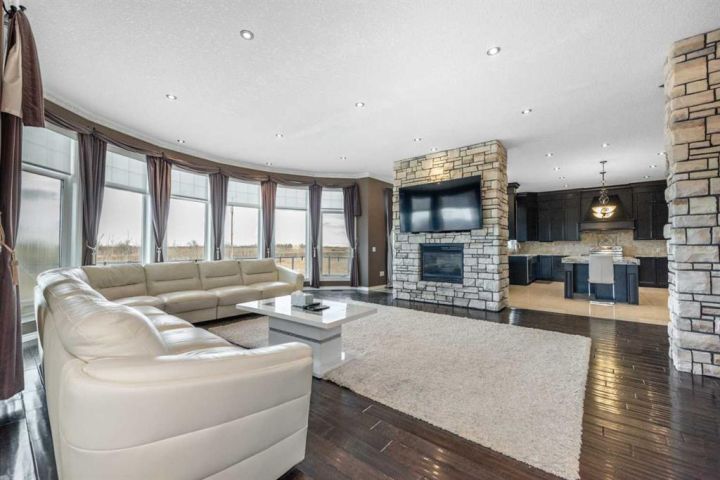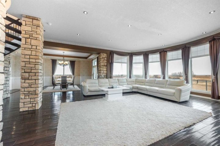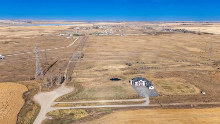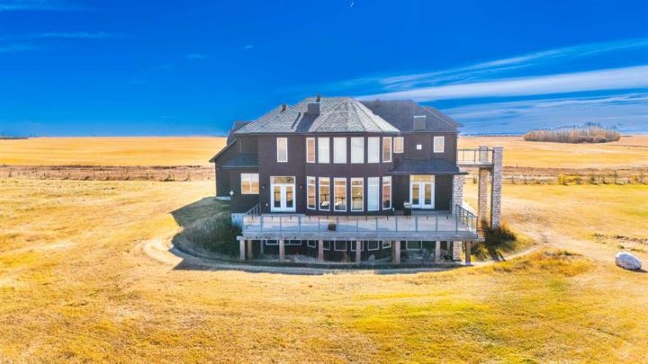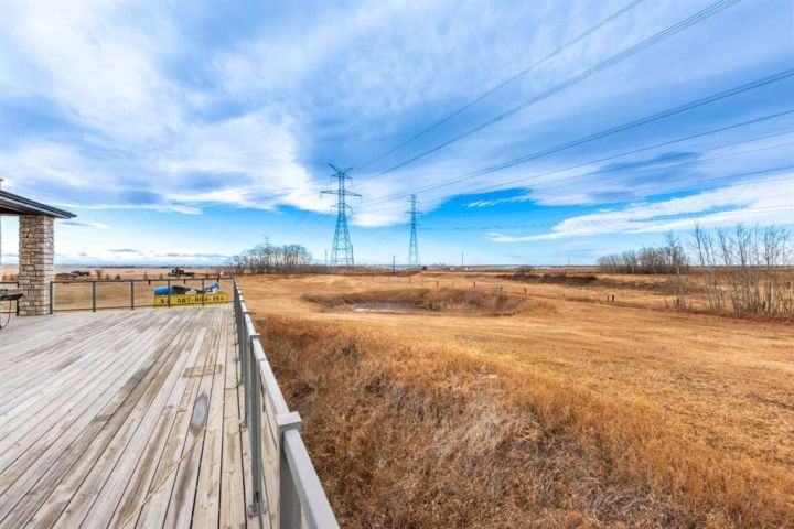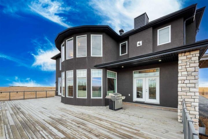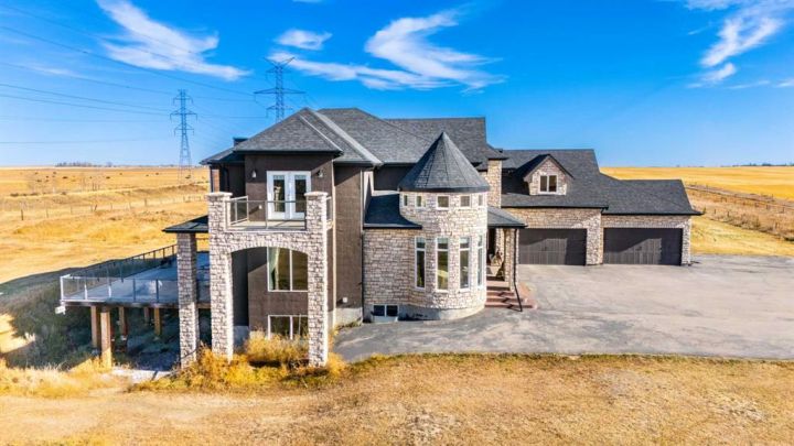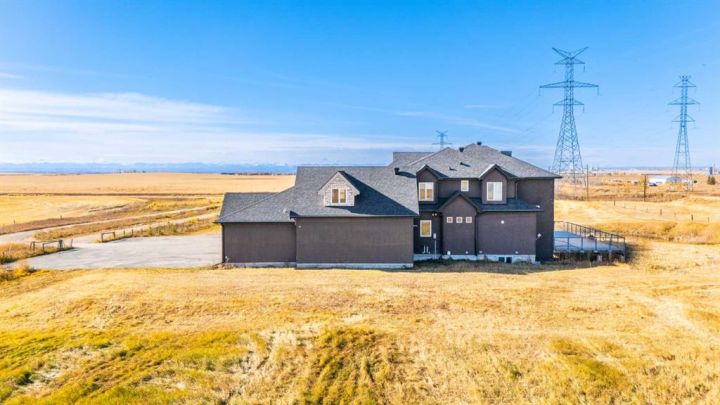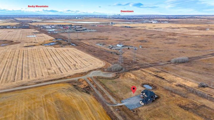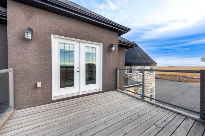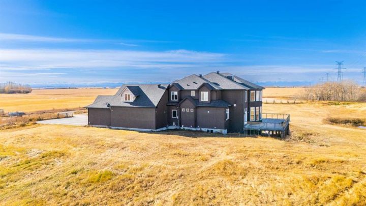 Welcome to this exceptional 4-acre estate offering breathtaking city and mountain views, a private gated driveway, and an unmatched blend of luxury and serenity—just 10 minutes east of Calgary. With over 4500 sq ft of beautifully designed living space across two levels, this custom home features a 4-car garage, walkout basement, and expansive indoor and outdoor areas ideal for both grand entertaining and everyday comfort. A dramatic double staircase and soaring open-to-below ceilings greet you in the impressive foyer, setting the stage for the home’s scale and elegance. The main level offers an open-concept design with rich hardwood flooring and large windows that frame peaceful landscape views. The chef’s kitchen is thoughtfully appointed with full-height cabinetry, stainless steel appliances, granite countertops, a hidden built-in range hood, wine cooler, and a built-in wine rack. A spacious centre island with bar seating and a bar sink adds both functionality and style. The walkthrough pantry flows directly into the mudroom and laundry room for exceptional convenience. The bright dining nook opens to a massive north-facing deck through French doors, creating seamless indoor-outdoor living. A formal dining room—also with French doors to the deck—adds versatility for hosting. The inviting living room features a double-sided gas fireplace shared with the kitchen, enhancing warmth and ambiance throughout the main floor. A main-level den provides an ideal workspace for professionals working from home. Upstairs, you’ll find three generous bedrooms and a large family room with lofted ceilings that elevate the home’s spacious feel. The primary suite is a true retreat, offering a private west-facing balcony with mountain views. The luxurious 5-piece ensuite includes a deep soaking tub set against a stunning window backdrop, a tiled steam shower with bench seating, dual vanities, and a private water closet. The custom walk-in closet provides exceptional storage and organization. Bedrooms 2 and 3 share a well-appointed 5-piece bathroom with dual sinks and a separate shower/tub and toilet area—ideal for busy families. The walkout basement is filled with natural light and is partially finished, including a recreation space, home theatre, gym, or additional bedrooms—designed to grow with your family’s needs. Located just minutes from Boulder Creek Golf Course, this extraordinary property combines peaceful country living with quick access to Calgary amenities. This is a truly remarkable estate home that must be seen to be fully appreciated.