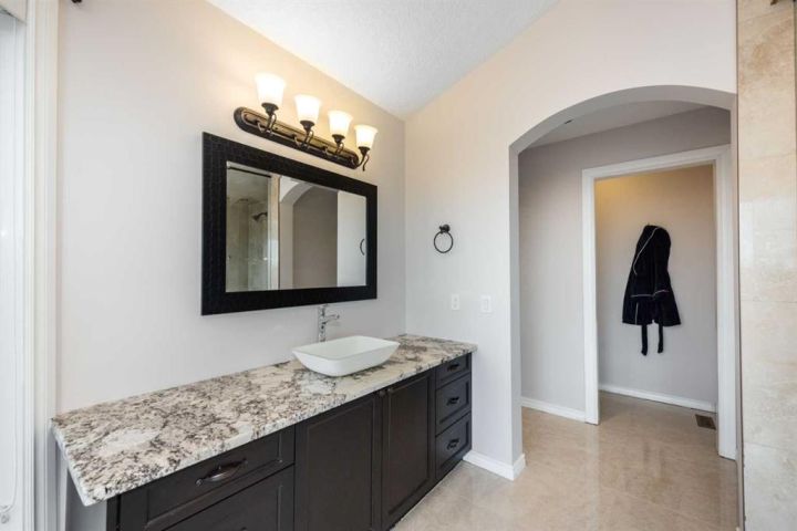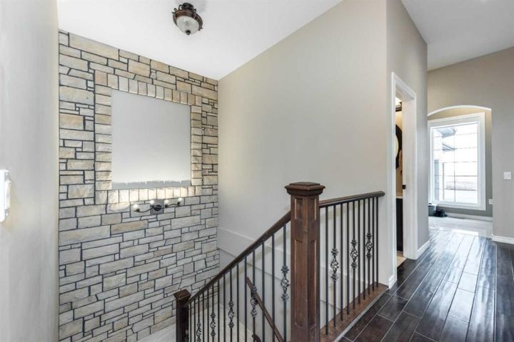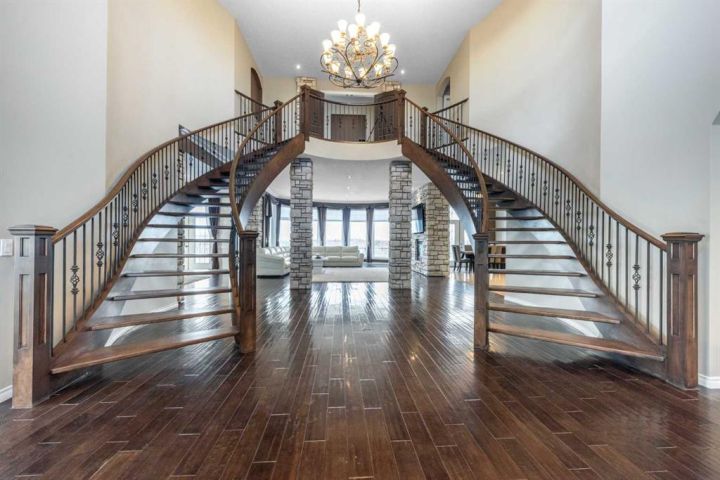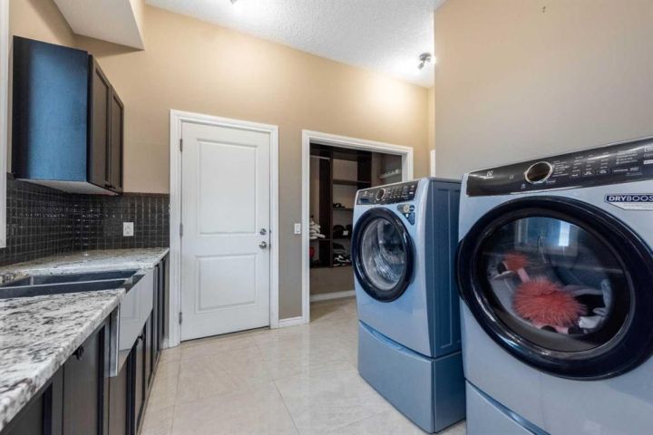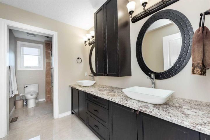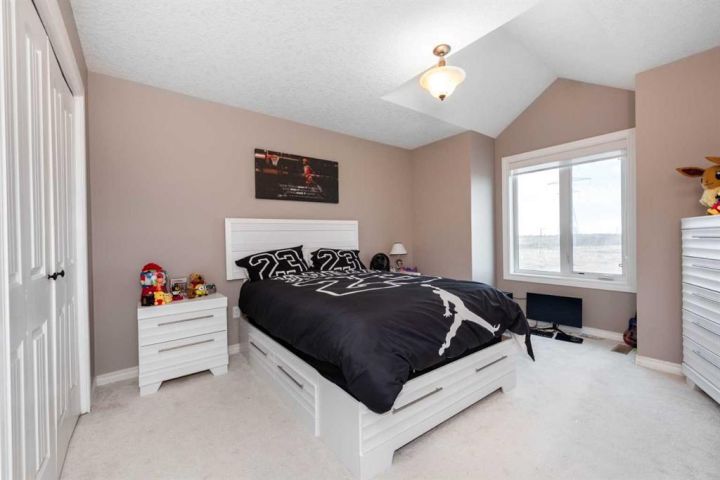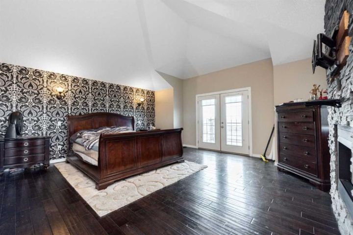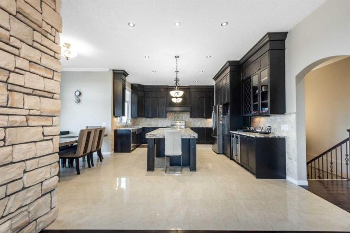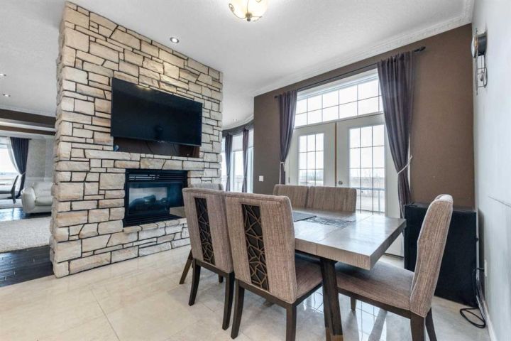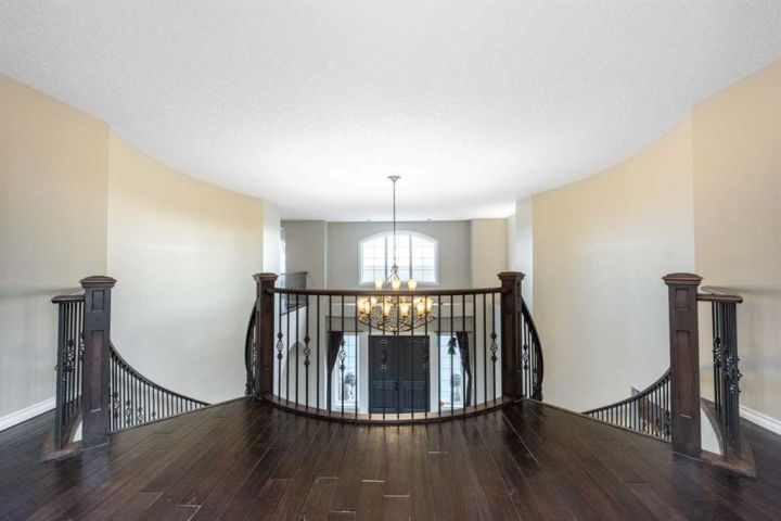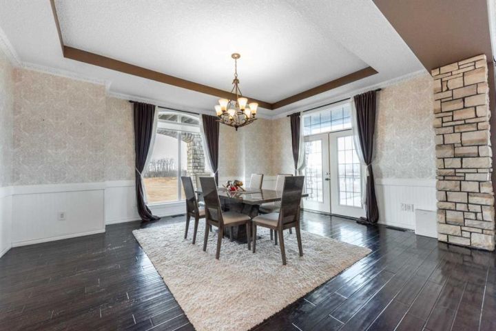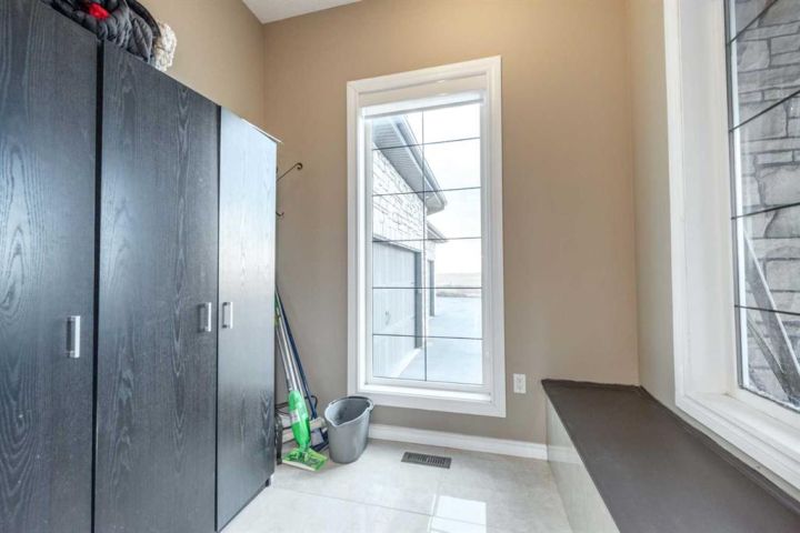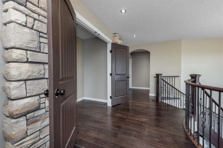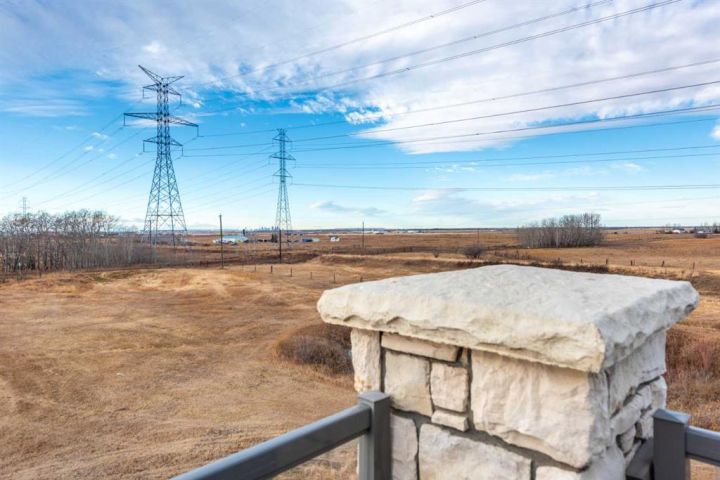 Welcome to this exceptional 4-acre estate offering breathtaking city and mountain views, a private gated driveway, and an unmatched blend of luxury and serenity—just 10 minutes east of Calgary. With over 4500 sq ft of beautifully designed living space across two levels, this custom home features a 4-car garage, walkout basement, and expansive indoor and outdoor areas ideal for both grand entertaining and everyday comfort. A dramatic double staircase and soaring open-to-below ceilings greet you in the impressive foyer, setting the stage for the home’s scale and elegance. The main level offers an open-concept design with rich hardwood flooring and large windows that frame peaceful landscape views. The chef’s kitchen is thoughtfully appointed with full-height cabinetry, stainless steel appliances, granite countertops, a hidden built-in range hood, wine cooler, and a built-in wine rack. A spacious centre island with bar seating and a bar sink adds both functionality and style. The walkthrough pantry flows directly into the mudroom and laundry room for exceptional convenience. The bright dining nook opens to a massive north-facing deck through French doors, creating seamless indoor-outdoor living. A formal dining room—also with French doors to the deck—adds versatility for hosting. The inviting living room features a double-sided gas fireplace shared with the kitchen, enhancing warmth and ambiance throughout the main floor. A main-level den provides an ideal workspace for professionals working from home. Upstairs, you’ll find three generous bedrooms and a large family room with lofted ceilings that elevate the home’s spacious feel. The primary suite is a true retreat, offering a private west-facing balcony with mountain views. The luxurious 5-piece ensuite includes a deep soaking tub set against a stunning window backdrop, a tiled steam shower with bench seating, dual vanities, and a private water closet. The custom walk-in closet provides exceptional storage and organization. Bedrooms 2 and 3 share a well-appointed 5-piece bathroom with dual sinks and a separate shower/tub and toilet area—ideal for busy families. The walkout basement is filled with natural light and is partially finished, including a recreation space, home theatre, gym, or additional bedrooms—designed to grow with your family’s needs. Located just minutes from Boulder Creek Golf Course, this extraordinary property combines peaceful country living with quick access to Calgary amenities. This is a truly remarkable estate home that must be seen to be fully appreciated.