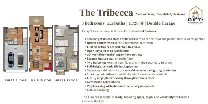Discover modern living at its finest 3 Bedroom, 2.5 Bathroom Tribecca townhome, complete with a versatile flex room and a rare double-car garage. Thoughtfully designed for comfort, functionality, and elevated style, this home offers generous living spaces and refined finishes throughout. Step inside to a bright first-floor flex room—perfect for a home office, gym, or hobby space. The main level boasts 10' ceilings, an inviting open-concept kitchen, and a stylish stained feature wall that adds warmth and sophistication. The chef-inspired kitchen is equipped with Samsung stainless steel appliances, including a French-door fridge with built-in water, sleek quartz countertops, full-height ceramic tile backsplashes, and tall upper cabinets with under-cabinet valance lighting. A large island anchors the space, ideal for gatherings and everyday living. Enjoy seamless indoor–outdoor living with two private balconies—one off the main floor living area and another in the secondary bedroom. The upper level features 9' ceilings, three well-appointed bedrooms, and spa-inspired bathrooms complete with full-height ceramic tile shower/tub surrounds. Automated zebra blinds throughout add modern convenience, while luxury vinyl plank flooring enhances durability and style. Additional highlights include: Main floor den for added flexibility Vinyl decking with aluminum rail and glass panels Double attached garage providing secure parking and storage Fully landscaped surroundings for a polished exterior presence Unbeatable Location: Just steps from Costco, Walmart, Cineplex, major banks, restaurants, and all the everyday essentials. Enjoy quick access to major routes—3 minutes to Stoney Trail, 4 minutes to Highway 1, and only 15 minutes to Downtown Calgary. You're also just 7 minutes from Gurdwara Sahib and a 1-minute walk to a nearby park and future school site. This home truly offers modern living in a vibrant new community with unmatched convenience and style. Whether you're a first-time buyer, investor, or searching for your next family home, this is an opportunity you don’t want to miss! Book your private showing today and experience everything this home has to offer.