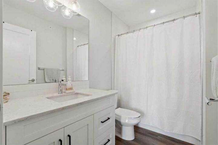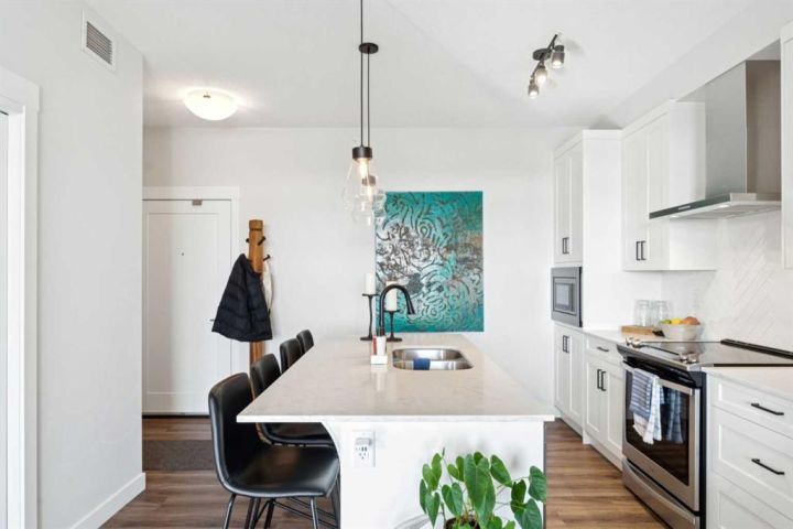Look no further for your TOP floor unit with beautifully curated interiors and a functional layout. This unique "Pratt" layout by Logel Homes, is for the home buyer who wants a larger single bedroom and larger common areas- no small bedrooms here! Enjoy upgraded finishings like the herringbone tiled backsplash, stainless steel appliance package, trendy black pendant lights, luxury vinyl plank flooring throughout and an integrated microwave that helps the functionality of the kitchen flow seamlessly. The spacious bedroom accommodates large furniture and welcomes personal items & belongings with a walkthrough closet. Tucked past the closet is a 4-piece ensuite with a tiled bath/shower and sparkling quartz counter tops. The unit has a second bathroom for guests- offering convenience and privacy for the homeowners. Just off the cozy living room are sliding balcony doors that take you to your private outdoor hub- which includes a gas barbecue! We cannot forget to mention, one of the best features of Auburn Bay... LAKE ACCESS! Enjoy year-round exclusive access to the Home Owners Association which includes a splash park, tennis courts, a fishing dock, a boathouse, picnic tables, gymnasiums and more. Nearby services like South Health Campus (3 min drive) and grocery stores, shopping, entertainment and parks just a couple blocks away, makes Auburn Bay a community of choice for many. Complete with a titled parking stall (end stall) and an over-sized storage locker compared to other units, this is an ideal choice for vibrant living in one of Calgary's most desired neighbourhoods. LIKE-NEW, gently lived in, this unit is truly turn-key and could be yours today! *Mortgage at 1.69% may be assumed, subject to buyer qualification and lender approval. Please contact listing agent for details.