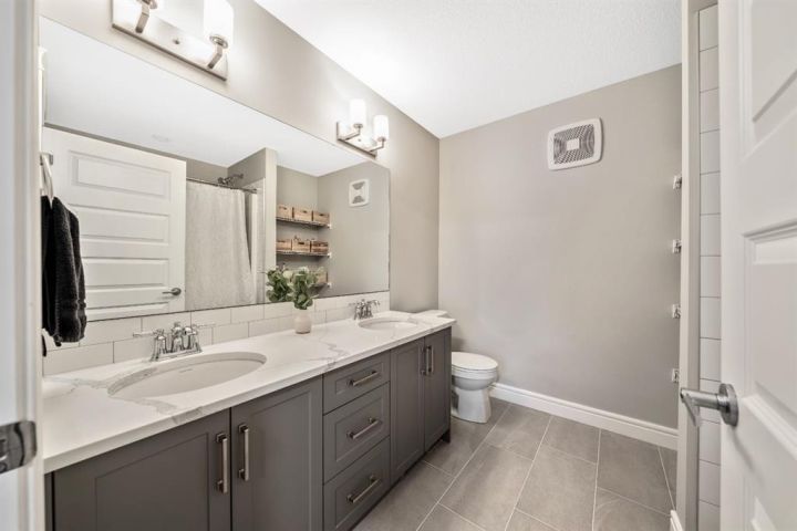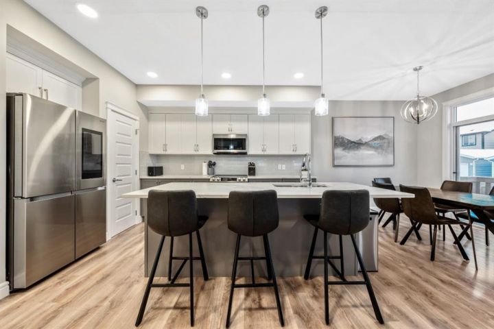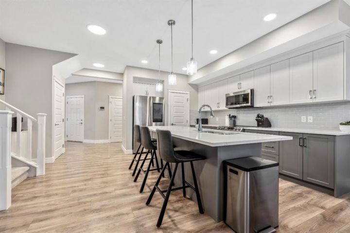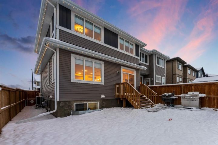 Welcome to this beautifully upgraded, FULLY FINISHED home offering modern finishes, thoughtful design, and exceptional comfort from top to bottom. Set on a fully fenced lot and complete with a HEATED DOUBLE GARAGE, this property is truly move-in ready with nothing left to do. Step inside to a bright, inviting main floor where style meets modern function. The open-concept layout features a stunning kitchen with upgraded appliances—including a smart fridge, induction stove, dishwasher, and microwave—plus a large island perfect for meal prep and gathering. The spacious living room offers a sleek electric fireplace with a custom pull-out mantel designed to discreetly house your media components. The generous dining area flows seamlessly to the private, fully fenced backyard with a storage shed and a gas line on the deck for those summer BBQ nights. Upstairs, the primary bedroom impresses with a luxurious 5-piece ensuite and a walk-in closet. Two additional well-appointed bedrooms share a beautifully finished 4-piece bathroom. The upper level also features a large laundry closet equipped with Samsung appliances, custom cabinets, and built-in shelving for added convenience. The professionally finished (permitted) basement expands your living space with a second electric fireplace, an included TV, and a full 4-piece bathroom with an extra-deep soaker tub—ideal for relaxing after a long day. The heated double attached garage is both comfortable and functional, complete with included wooden shelving for extra storage. Additional features and upgrades include: a tankless water heater, central air conditioning, central vacuum, Gemstone exterior lighting, two electric fireplaces, all window coverings (including blackout blinds), fully fenced yard, and an included storage shed. Located in Heartland, this home offers quick access to nearby amenities and an easy escape to Ghost Lake, Canmore, and the Rocky Mountains—perfect for weekend adventures and everyday convenience.