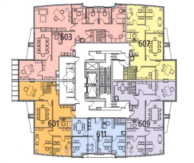 All office work stations and their chairs, refrigerator, microwave, dishwasher