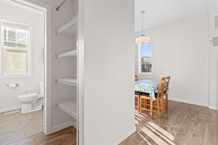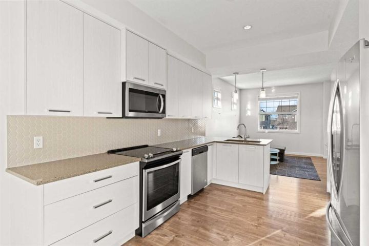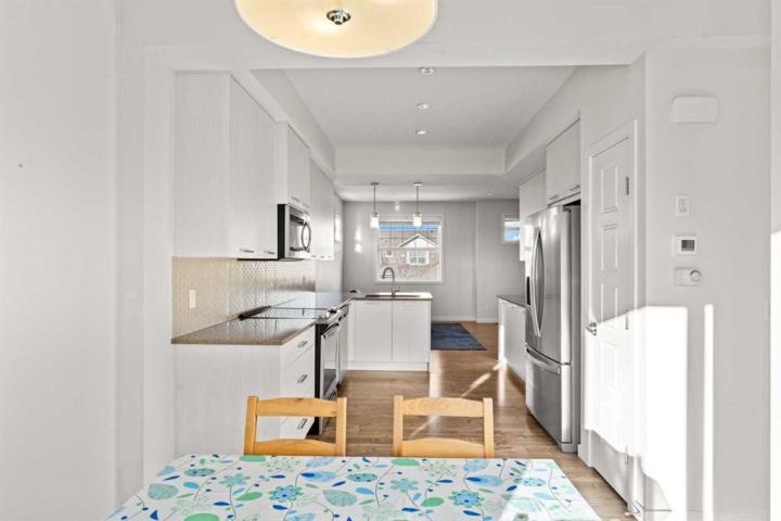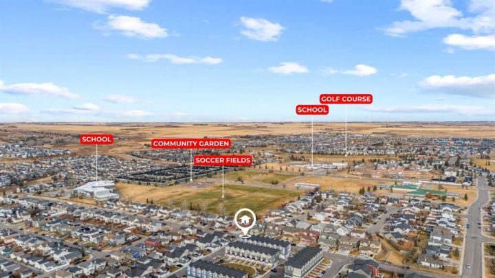 Welcome to this beautifully kept corner-unit townhouse in the established community of Sagewood, offering peaceful living while staying close to all amenities. This bright and functional home features 3 bedrooms, 2.5 bathrooms, and a double attached tandem garage, ideal for families, first-time buyers, or anyone seeking convenience plus peace. As you walk up to the main level, you are greeted by a sun-filled dining area with a south-facing patio door that opens onto a private balcony equipped with a BBQ gas line. The open-concept kitchen includes stainless steel appliances, granite counters, ample cabinetry, and a convenient pantry. Adjacent to the kitchen is a spacious living room with a large window overlooking the quiet street. A well-placed 2-piece bathroom completes the main floor. The upper level is bright and thoughtfully designed. It features a generous primary bedroom with a 3-piece ensuite and walk-in closet, a second bedroom with its own walk-in closet, a third bedroom with ample storage, a 4-piece common bathroom, and upper-floor laundry for added convenience. This well-maintained home is ideally positioned in a convenient and family-friendly location. You are within walking distance of Our Lady Queen of Peace Elementary School, C. W. Perry Middle School, ponds, playgrounds, walking paths, and Woodside Golf Course. Everyday amenities including Sobeys, restaurants, gas station, and local shops are only minutes away. Commuting is smooth with quick access to 8 Street, Veterans Boulevard, and easy connectivity to Deerfoot Trail. You are also a short drive from Airdrie Main Street, Genesis Place Recreation Centre, and the new Airdrie Public Library, making this property a perfect blend of comfort, accessibility, and lifestyle. This home has everything you need and more. Book your private showing today and experience the value for yourself.
