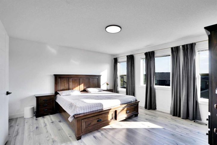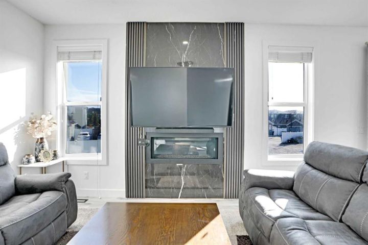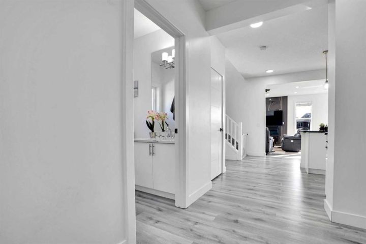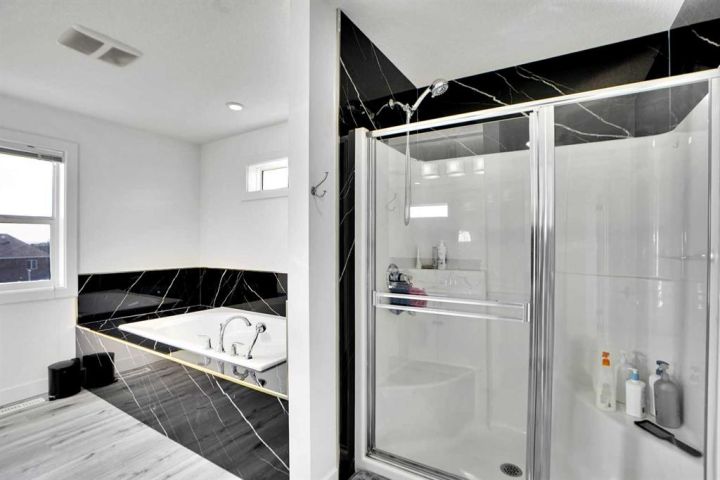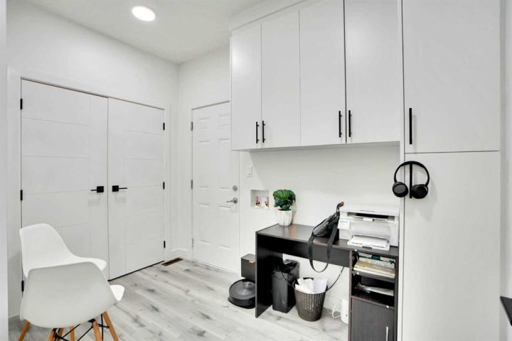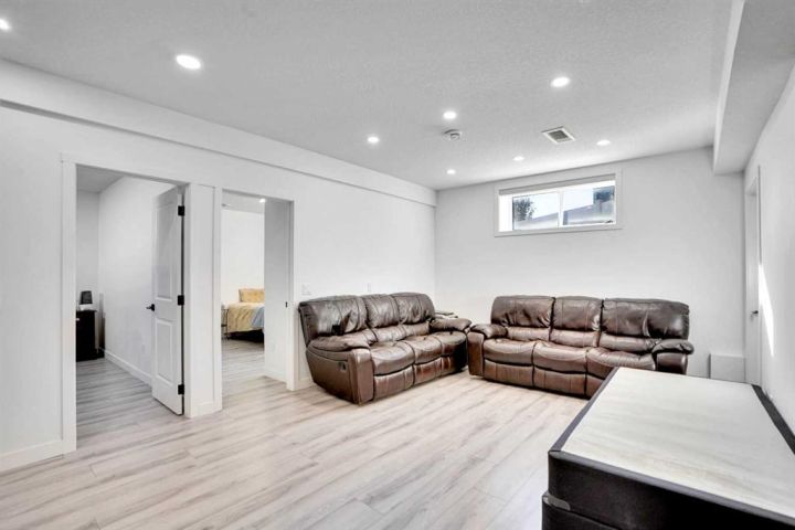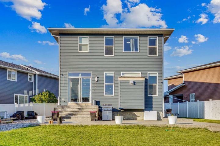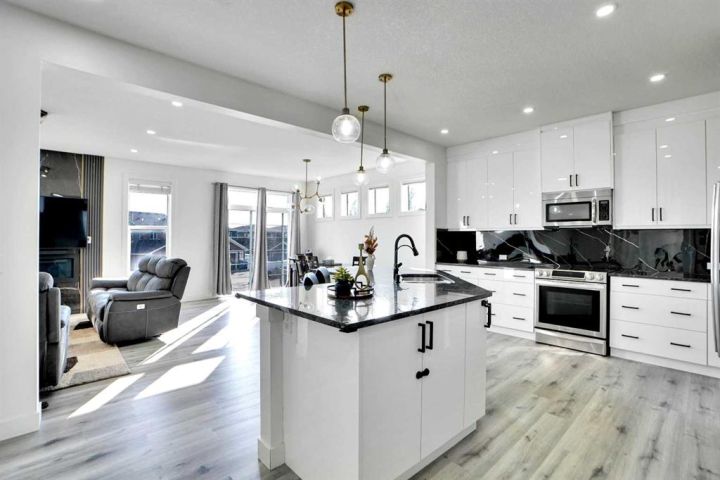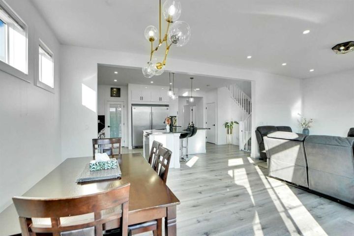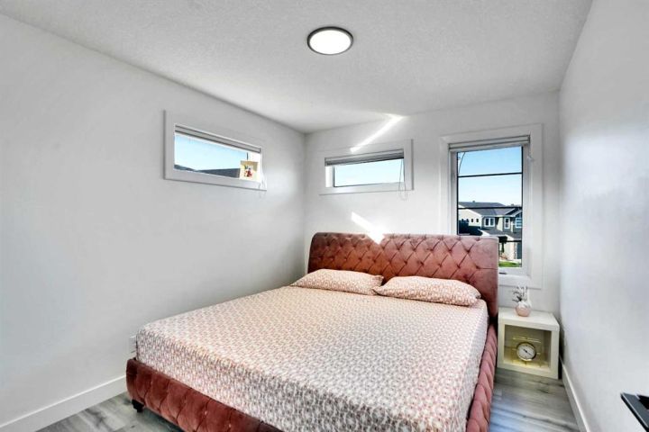 A Rare Opportunity on One of Redstone’s Largest Pie-Shaped Lots! This fully renovated detached home offers over 2,450 SQFT. of thoughtfully designed living space, with a front-attached garage, rear street access, ample street parking, and City-approved commercial parking—ideal for home-based businesses or extra vehicles. Inside, you’re welcomed by a spacious foyer, a custom feature wall, home office, and mudroom. The main kitchen boasts granite countertops, high-end finishes, and opens to a large living room with a gas fireplace and feature wall. A separate spice kitchen with its own pantry adds convenience. Upstairs, enjoy a bright bonus room, a luxurious primary suite with a 5-piece ensuite and custom walk-in closet, plus three additional bedrooms, a full bath with standing shower, and upstairs laundry. The fully finished basement suite (illegal) with separate side entrance includes two generous bedrooms, a modern kitchen with pantry, a full bathroom, and stacked laundry. Set on one of the largest lots in the community with unique dual access and commercial-use potential, this home is truly a rare opportunity in Redstone. Don’t miss your chance to own this exceptional property!