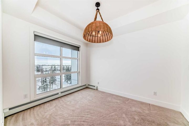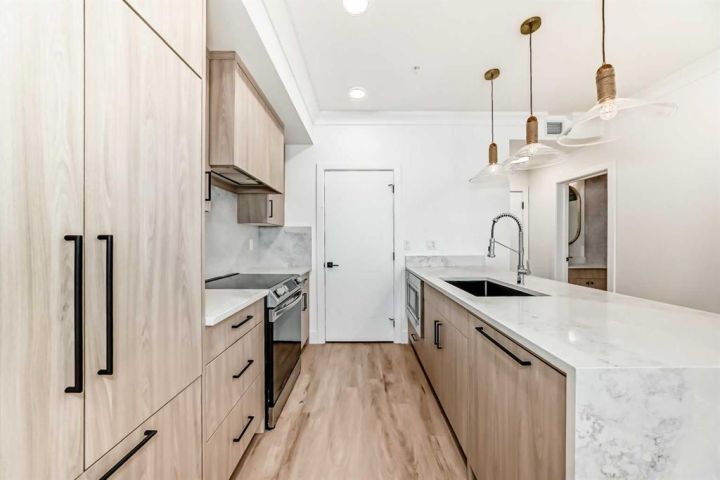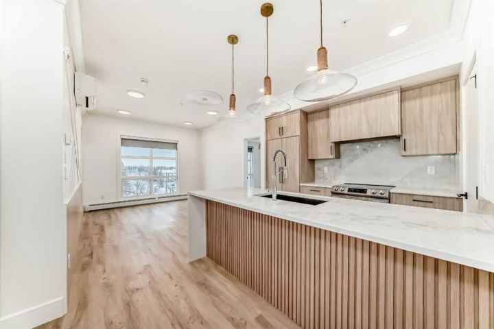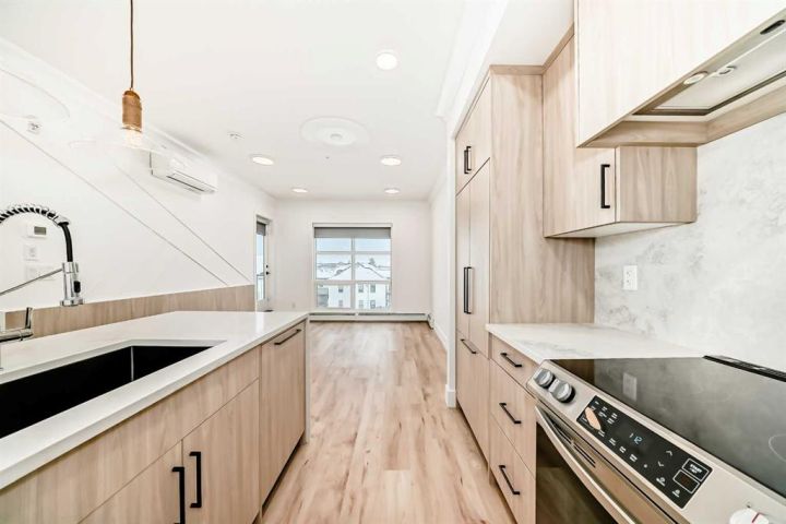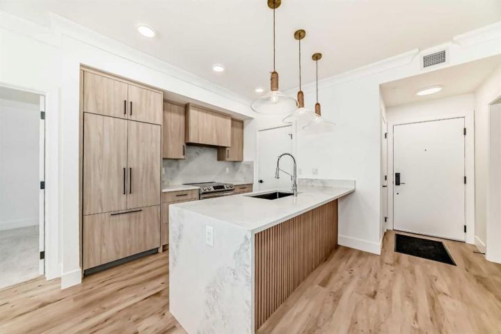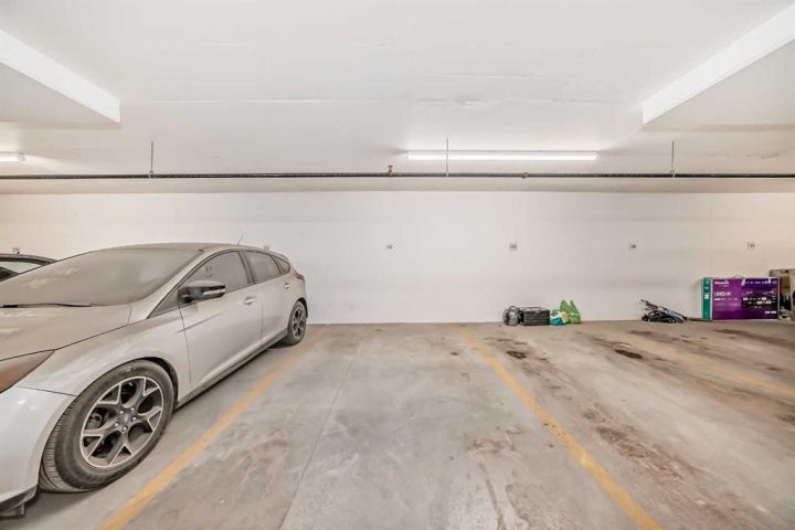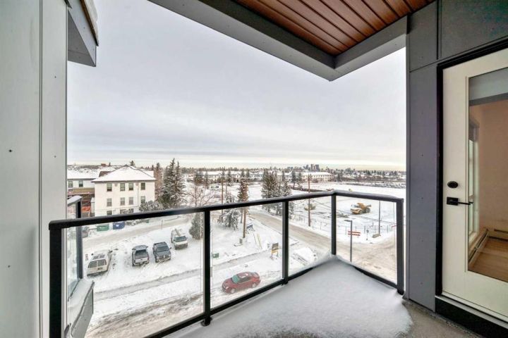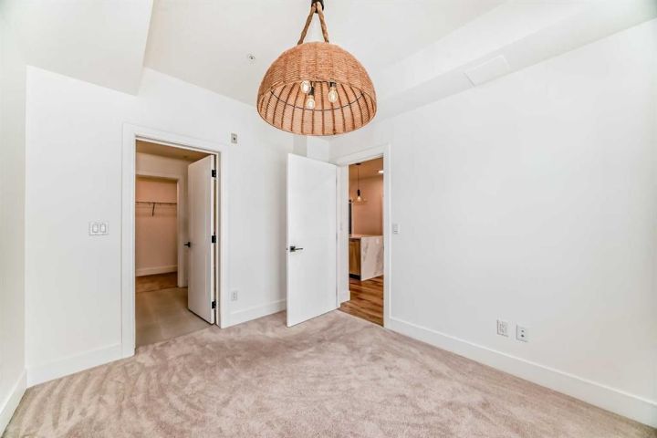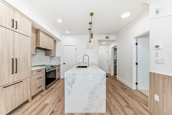 OPEN HOUSE Saturday Nov 29, 1-4pm. Welcome to the Quesnay in Calgary's historic Currie Barracks, a community built with a walkable urban design, heritage sites, bike paths, green spaces and dog parks, all minutes from the downtown core. This 2 bed, 2 bath offers an elevated living experience with unobstructed VIEWS of the DOWNTOWN SKYLINE and a front row seat to epic Calgary sunrises. The kitchen showcases a quartz waterfall countertop and panelled Fisher Paykel appliances, custom light fixtures and a designer feature wall. A private covered balcony, CENTRAL AIR CONDITIONING, titled underground parking stall and titled storage locker for comfortable, convenient living. Check the comparables, this one is priced to sell. Immediate possession.