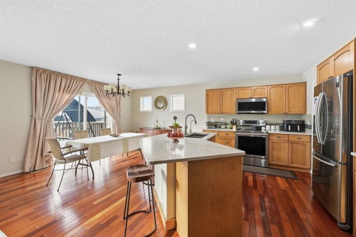 124 Evansbrooke Landing NW – Executive Walkout Backing Onto West Nose Creek Valley A Rare Opportunity in One of Evanston’s Most Sought-After Locations Welcome to this beautifully maintained, move-in ready executive 2-storey home, perfectly positioned on a quiet street and backing directly onto the serene West Nose Creek Valley and expansive environmental reserve. Offering a desirable walkout basement, central A/C, and stunning, unobstructed views, this property blends comfort, elegance, and an exceptional natural setting. As you enter, you are greeted by the warmth of rich Brazilian cherry hardwood flooring and a bright, inviting floorplan designed to maximize natural light. The updated kitchen is a true focal point—featuring new quartz countertops, upgraded maple cabinetry, a central island ideal for meal prep, and a convenient corner pantry. Whether hosting guests or enjoying family time, this space effortlessly accommodates it all. The great room offers a welcoming atmosphere with its cozy corner gas fireplace finished in slate, topped with a TV niche, and framed by oversized windows that showcase sweeping valley views. A versatile front room on the main floor provides the perfect flex space to suit your lifestyle—ideal for a home office, formal dining room, or den. The home is further enhanced with energy-efficient upgrades including low-E windows on the main and upper rear elevations, plus triple-pane windows in the primary bedroom for added comfort and quiet. Upstairs, a wide maple-railed staircase leads to a spacious bonus room—perfect for movie nights or a relaxing retreat—along with three generously sized bedrooms. The primary bedroom captures tranquil valley views and includes plenty of space for a king-sized layout. The fully developed walkout basement significantly expands your living space, offering a large family room with its own fireplace, a fourth bedroom, and a full bathroom. It also features an illegal suite setup, equipped with the components you need if you wish to legalize it, providing outstanding flexibility for extended family, guests, or future rental potential. Step outside and enjoy outdoor living at its finest. The upper deck provides a peaceful spot to take in the panoramic views, while the professionally landscaped yard below offers direct access to walking paths and the natural reserve. This is truly one of the most picturesque backdrops available in the community. The location is unbeatable—quiet and family-friendly, just a short walk to Evanston Elementary School, Calgary Transit stops, playgrounds, and community pathways. You’re also minutes from Creekside Shopping Centre, grocery stores, restaurants, major commuter routes, and all the amenities that make Evanston one of Northwest Calgary’s most desirable neighborhoods. This is a rare chance to own an executive walkout home with exceptional privacy, stunning views, and an irreplaceable location. Don’t miss it—homes like this don’t come to market often.