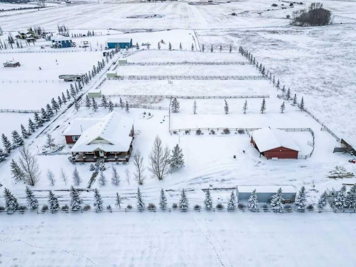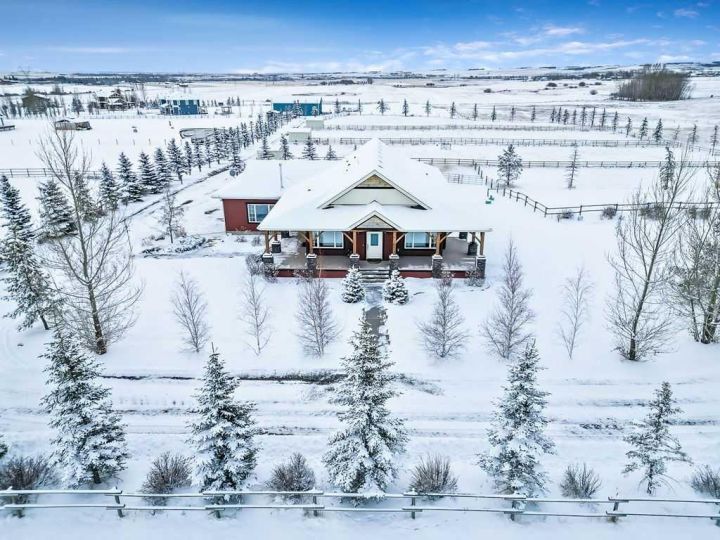 Every now and again an acreage property comes on the market that ticks a lot of sought after boxes and is in move in condition-this may be the one for you! This 1781ft2 appealing custom built walk out bungalow is situated nicely on 5 acres and definitely has the horse enthusiast in mind with 3 large HORSE pens all with shelters and automatic waterers PLUS A HEATED BARN/shop! This well thought out property oozes charm and functionality right from the custom gated entrance to the last custom rail fence and everything in between! So much so, that only a personal visit can show! This clean well maintained home exudes "quiet luxury" and offers the perfect combination of quality and practicality in every sense in order to truly enjoy the rural lifestyle! Close enough to Okotoks and Calgary (12 minutes) to make a daily commute easy and stress free! Come take a stroll through this appealing country acreage and start planning your next move! OPEN HOUSE Sunday DECEMBER 7, 1:30-4 pm.