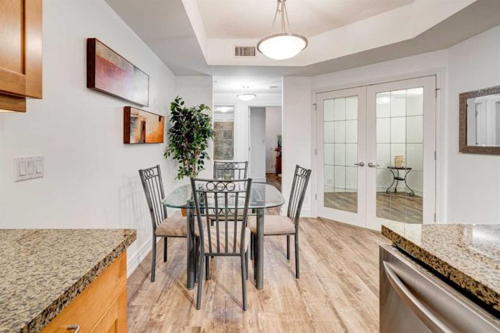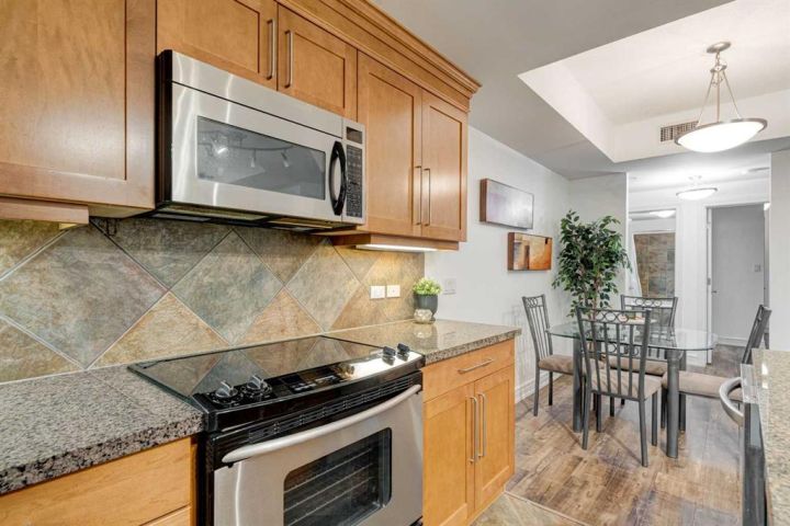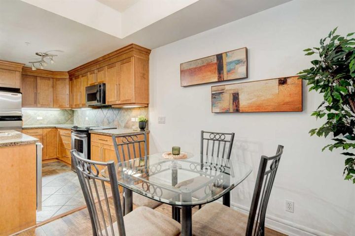 Sophisticated 1 bedroom + a den, 5th floor unit with downtown and river views. Ideally located in the heart of Eau Claire just one block from the Peace Bridge, Prince’s Island and the Bow River. This executive unit is stylishly designed with timeless finishes, central air conditioning and an open floor plan creating an airy ambience. Inspiring culinary exploration, the kitchen is the true hub of the home featuring granite countertops, stainless steel appliances, full-height cabinets and a full-sized centre island with a breakfast bar for casual eats. Gather over large meals or host guests in the adjacent dining room with unobstructed sightlines ensuring easy connectivity. Sit back and relax in front of the warm gas fireplace in the inviting living room or enjoy peaceful coffees on the balcony with east exposure for early morning sun. Downtown and river views provide the breathtaking backdrop to your summer barbeques and outdoor unwinding time. French doors lead to the den, perfect for guests or a home office. Retreat at the end of the day to the calming primary complete with access to the stylish 4-piece bathroom. Adding to your comfort and convenience are in-suite laundry, titled parking, a separate storage locker, a car wash and a full-time concierge. Truly an exceptional condo in an amenity-rich building that is an outdoor lover’s dream - walk or bike downtown, stroll along the river or visit the many shops, cafes and restaurants that this vibrant community has to offer. Close to the future green line and the new redevelopment site planned for the old market area. This outstanding location has it all! Condo fee includes ALL UTILITIES (except internet/TV).