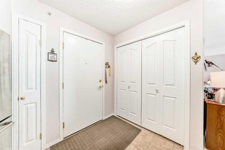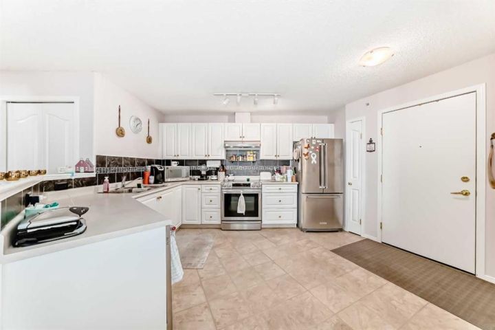 Welcome to Suite 410 at 5000 Somervale Court SW ( A 55+ adult age restricted complex... NO pets ) — the largest one-bedroom floor plan in the entire building! This sought-after Kendall model offers a generous 822 sq. ft. of comfortable, thoughtfully designed living space, making it ideal for anyone seeking extra room without compromising convenience. Step inside and immediately notice the expansive kitchen—one of the biggest you’ll find in a one-bedroom condo. With upgraded stainless steel appliances, excellent counter space, and abundant cabinetry, this kitchen truly stands out. The spacious primary bedroom easily accommodates large dressers and a queen-size bed—and even a king, if you prefer. Just off the hallway, you’ll also appreciate the full laundry room with great storage space, offering far more functionality than the typical condo closet. The bathroom has been smartly upgraded with bathtub modified into a walk in shower, making it far easier and safer to step in and out. Enjoy one of the larger balconies in the complex, offering a pleasant southwest exposure—perfect for bright, sunny mornings and relaxing outdoor time. The suite is conveniently located just around the corner from the elevators, making daily living even more effortless. This well-managed 55+ adult living community is known for its vibrant social scene and extensive on-site amenities, including a recreation room, fitness area, media room, library, crafts room, and even an in-house hair salon offering manicures and pedicures. Everything you need is right at your doorstep. Your condo fees include heat (gas) and electricity, adding tremendous value and predictable monthly costs. The location is unbeatable—a few blocks from Walmart, Calgary Co-op, numerous restaurants, and only one block south of the Somerset LRT station, giving you easy access to the entire city. Beautiful size, excellent floor plan, incredible amenities, and a truly lovely unit—available now.