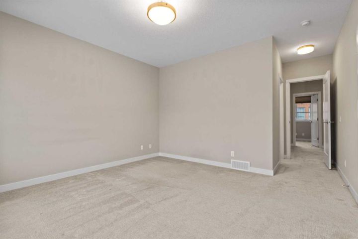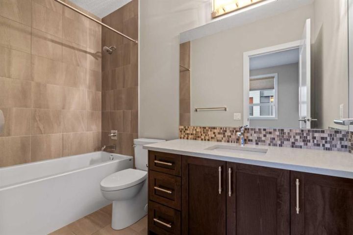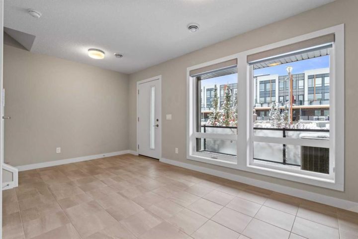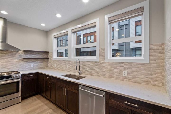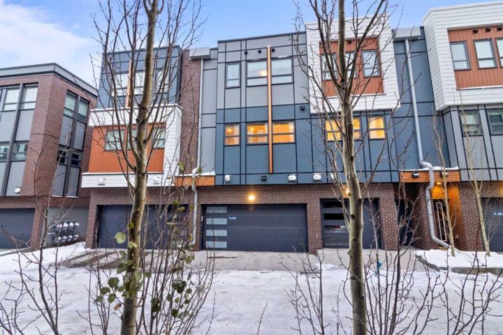 Experience modern, executive townhome living in the highly sought-after University District. This home offers a spacious 1,660 sqft of meticulously designed air conditioned space., overlooking the quiet inner courtyard. The ground floor provides direct entry from the double attached garage into a spacious den/office. This versatile flex space is perfect for a home-based business, gym, or additional storage. The main living level is an entertainer's dream, featuring high ceilings and an open-concept layout. The gourmet, U-shaped kitchen is highlighted by a gas stove, sleek quartz countertops, a generous breakfast island, and premium Bosch stainless steel appliances. The spacious dining and living areas lead to your private deck, which offers a view over the complex’s inner courtyard and community playground. A stylish two-piece powder room completes this level. The top floor is dedicated to rest and convenience. It features a practical upper-level laundry and the executive Dual Primary Suite layout—a premium feature consistent with the complex's top-selling homes. The main suite offers a double closet and a luxurious four-piece ensuite with a dual-sink vanity and walk-in shower. The second master retreat also features its own private four-piece ensuite and ample closet space. The added bonus is the well run complex is also pet friendly. Located in Calgary’s vibrant University District, this home provides an unmatched urban lifestyle. Enjoy walking distance to the U of C, Foothills Hospital, and a growing list of premium retail amenities. University District's popular main street offers an anchor Save-On-Foods, Cineplex VIP Theatres, OEB Breakfast Co., Analog Coffee, and more. This is a turn-key opportunity in an established, popular community.