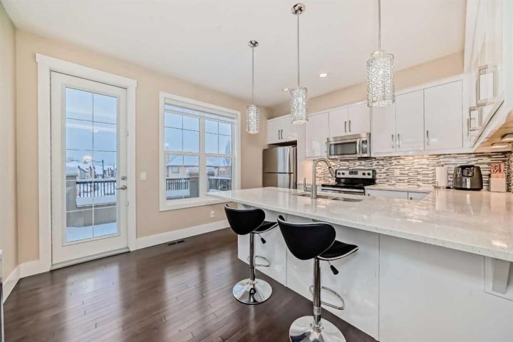 Gorgeous luxury townhouse in Quarry Park! This beautiful home has been extensively upgraded with high-quality finishes throughout. The main living area features hardwood floors, while the chef’s kitchen impresses with quartz countertops, custom-made cabinets, a large island, upgraded stainless steel appliances, and exquisite light fixtures. Just off the kitchen, enjoy a private deck overlooking a peaceful linear park to the east, along with a lower-level patio with the same exposure. Perfect for morning coffee, BBQing, or relaxing outdoors. The upper level offers dual primary bedrooms, each with a walk-in closet and a 4-piece ensuite. Ideal for couples, guests, or roommates. The laundry is thoughtfully located upstairs for maximum convenience. The attached garage provides additional storage and includes access to a separate storage room. The location is prime! Walking and biking distance to amenities such as Co-op, Sobeys, the YMCA with swimming pool, public library, dentist, medical clinic, and numerous restaurants. Enjoy quick access to Carburn Park and Sue Higgins Off-Leash Park. You will love living in this highly desirable SE community—book your showing today!