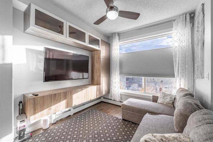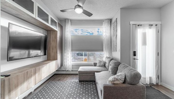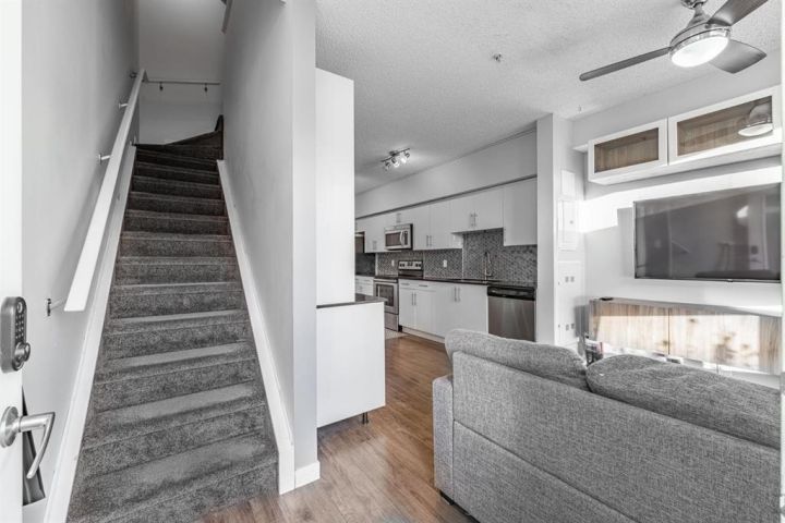 Welcome to this well kept townhome style condo in Mount Pleasant. It sits on a quiet, tree lined street with quick access to SAIT, the CTrain, Kensington, Confederation Park, Riley Park, restaurants, coffee shops and everything else the area is known for. The main floor feels open and bright with large windows and a clean modern look. The kitchen has quartz counters, stainless steel appliances and plenty of cabinet space, and it flows nicely into the living and dining areas. The unit also has air conditioning which is a huge bonus in the summer. You have a front patio for morning coffees and a private back patio for grilling or relaxing. The upper floor has a spacious bedroom and a large loft area. The loft is big enough to use as an office, workout space, guest area or anything else you need. A full four piece bathroom and laundry are also upstairs. The building is well managed and has a central courtyard along with titled underground parking and visitor parking. A comfortable home in a great location with flexible space and modern conveniences. Come see it in person.
