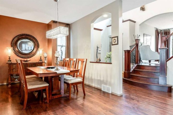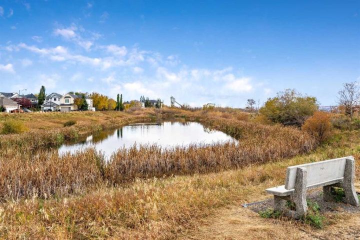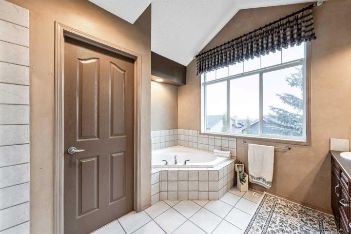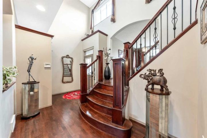 Former Jayman Showhome in Cougar Ridge offering over 3,000 sq.ft. of bright, well-designed living space with a fully finished walkout basement. The main floor features 9 ft ceilings, hardwood floors, and an open kitchen with granite counters, stainless steel appliances, and an island. A few steps up, a cozy bonus room provides a bright flex space. Upstairs includes three bedrooms, a primary bedroom with walk-in closet and 5-piece ensuite with double sinks, a second full bathroom with double sinks, and a large office. The walkout basement has large windows, two bedrooms (one with high ceilings), a full bathroom, a spacious rec area, and a living room with floor-to-ceiling stone fireplace and bar. Additional features include a finished and insulated garage, new water heater, new washer, updated basement flooring, A/C, central vac, sound system, and a mature treed yard. Located on a quiet street near a pond, scenic trails, and top amenities.