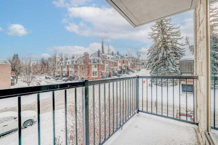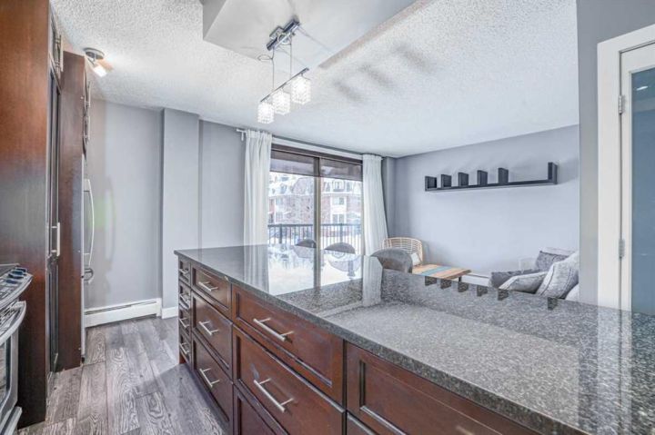 Beautifully updated and move-in ready, this stylish home in the James A Wolfe building pairs modern design with an exceptional Lower Mount Royal location. A $75,000 renovation a few years ago created a warm, contemporary interior where wide-plank flooring, designer lighting and a neutral colour palette establish a cohesive atmosphere. An open floor plan enhances daily living and entertaining, anchored by a chef’s kitchen appointed with granite countertops, upgraded Whirlpool appliances, full-height cabinetry and a generous centre island that encourages gathering and easy conversation. The adjacent living room offers space to relax, while a large patio slider opens to a covered balcony that extends the living area outdoors for summer barbeques, morning coffees and weekends unwinding with impressive downtown views. A spacious bedroom enjoys natural light and quiet comfort, matched by a stylish 4pc bathroom featuring modern finishes. Upgraded in-suite laundry with a Bosch washer and dryer adds additional convenience. Concrete building construction contributes to a peaceful environment along with the advantage of bike storage and the unit includes what may be the best extra-large end corner parking stall in the complex, offering ease and flexibility for larger vehicles. Reasonable condo fees support well-managed building operations. The setting places you steps from the energy of 17th Ave where boutique shops, cozy cafes, restaurants and pubs create a vibrant streetscape. Walk or bike to downtown, explore nearby pathways along the Bow River or reach MRU in minutes by car. This is an opportunity to enjoy a refined, urban lifestyle in one of Calgary’s most sought-after inner-city neighbourhoods!