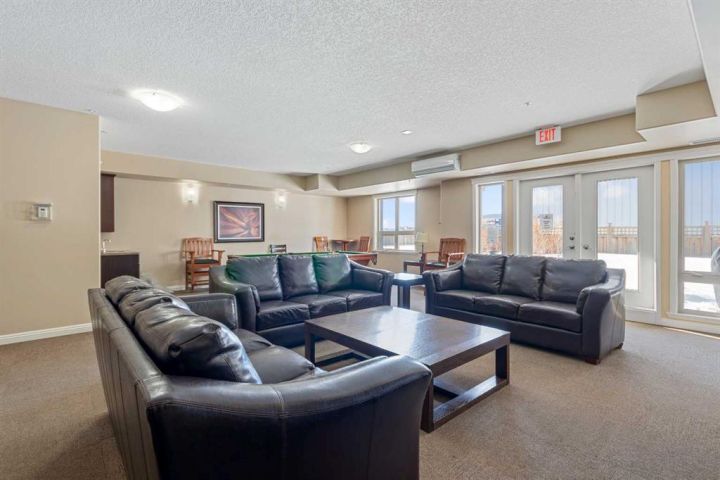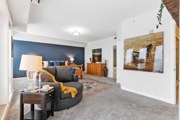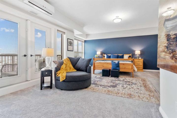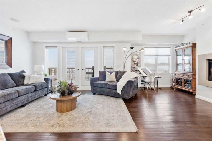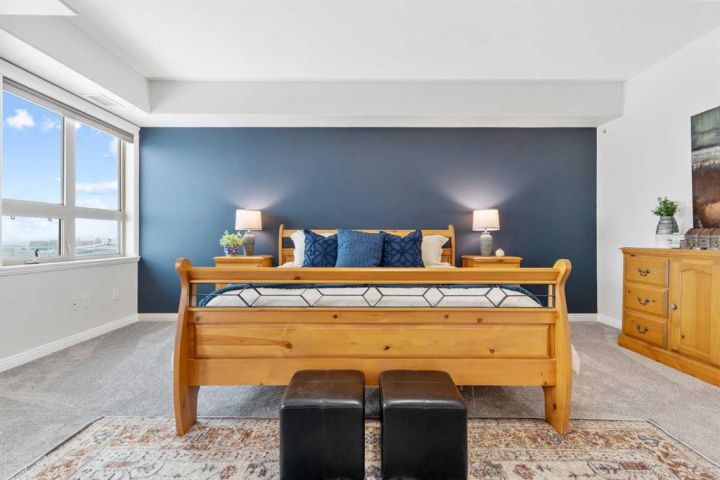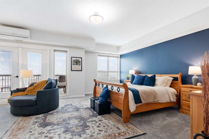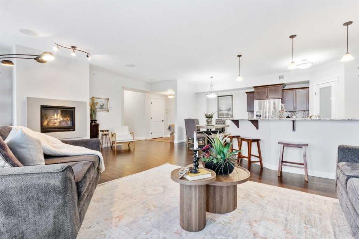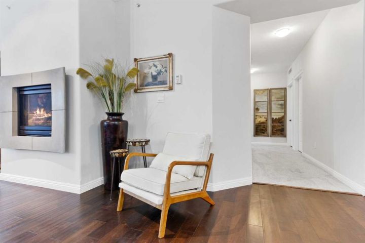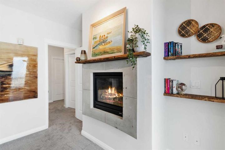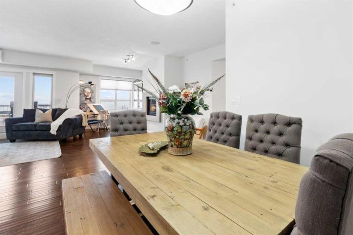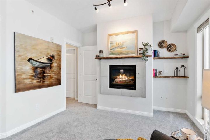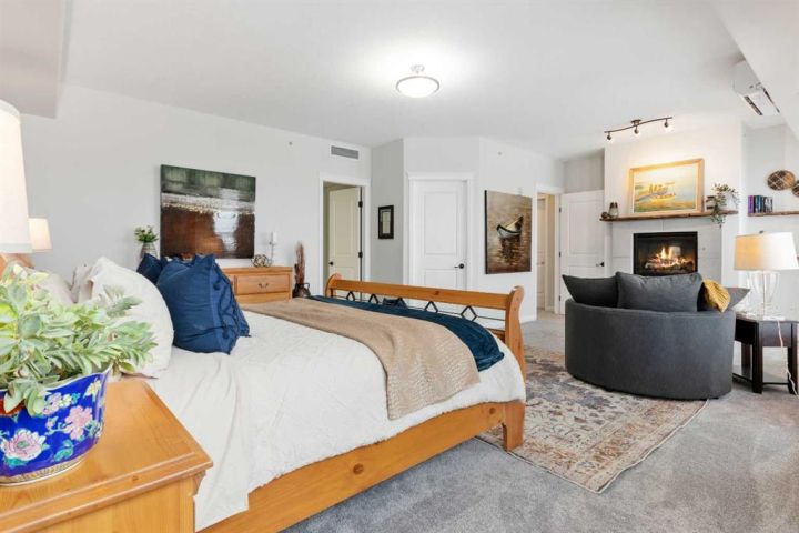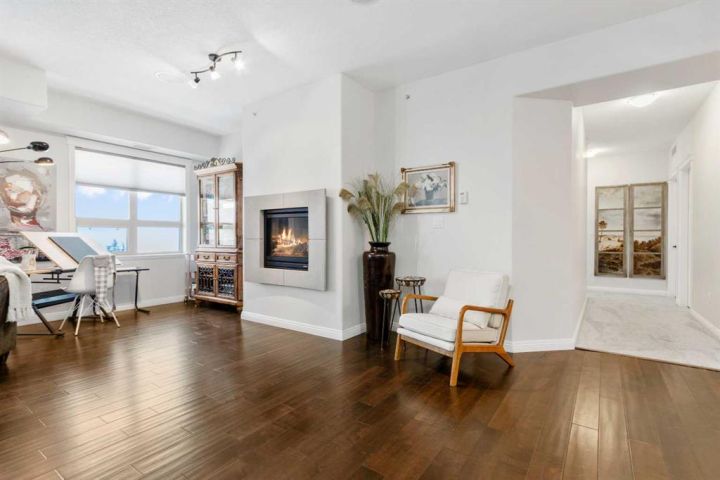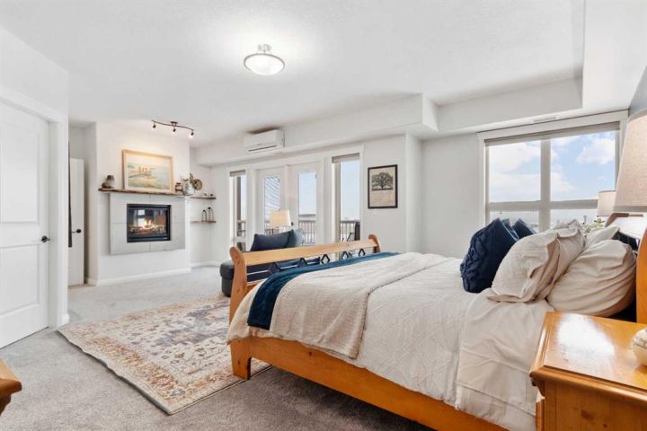 This stunning two-bedroom penthouse suite at Cornerstone is where elevated living and true luxury come together. Filled with natural light from its open layout and expansive windows, the space feels warm, spacious, and immediately impressive. A generous entry welcomes you into a beautifully appointed kitchen with stone countertops that flows seamlessly into the dining area and great room. This is a space designed for both connection and comfort, anchored by a gas fireplace and built-in surround sound, perfect for hosting or unwinding at the end of the day. Step directly from the dining area onto the deck and take in sweeping city views, complete with a gas line for effortless outdoor use. The guest bedroom is impressively sized and features a walk-in closet, offering exceptional storage. The primary suite is a true retreat, complete with its own gas fireplace, a second private balcony, and a spacious ensuite featuring a soaker tub, separate shower, double sinks, and a private water closet, all connected to a large walk-in closet. Cornerstone offers a lifestyle beyond the suite itself, with amenities that elevate everyday living. Residents enjoy access to a fitness room, a beautifully furnished owners’ lounge with an outdoor patio and BBQ, meeting rooms, guest suites, cozy sitting areas, a dedicated mail room, and two elevators. This unit includes all appliances, one titled underground parking stalls, and exclusive access to a resident car wash. This well curated penthouse delivers privacy, comfort, and sophistication an exceptional opportunity for those seeking refined, carefree condominium living at its finest.