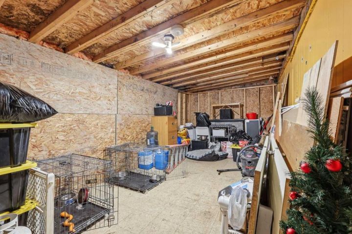 Portable AC Units, Shed, Curtains, Building supplies in bonus room, Portable Fireplace in bonus room, Filing Cabinet in bonus room, Boxed bathroom mirror, boxed faucet, and inset shelving in bonus room.