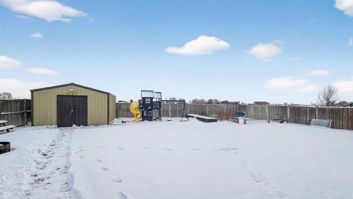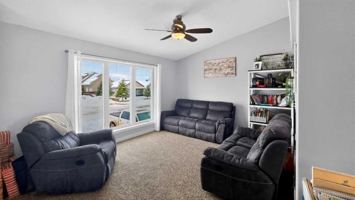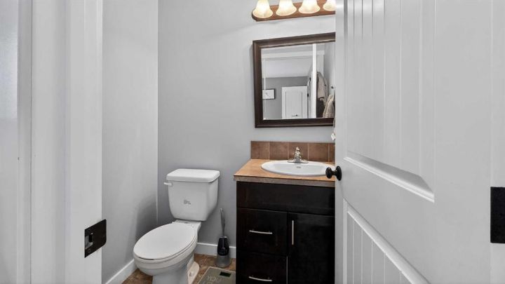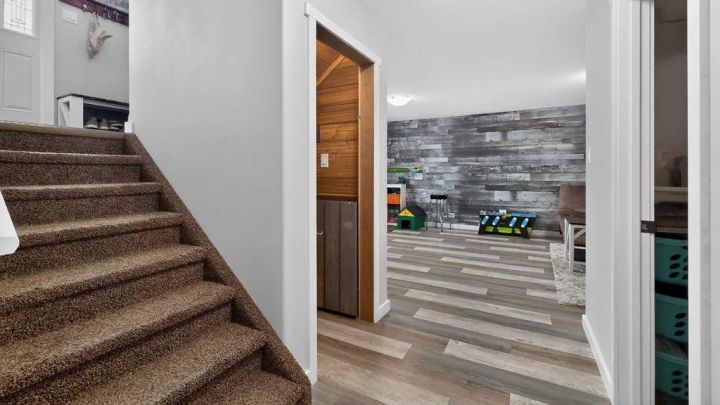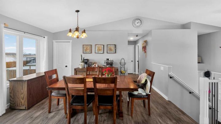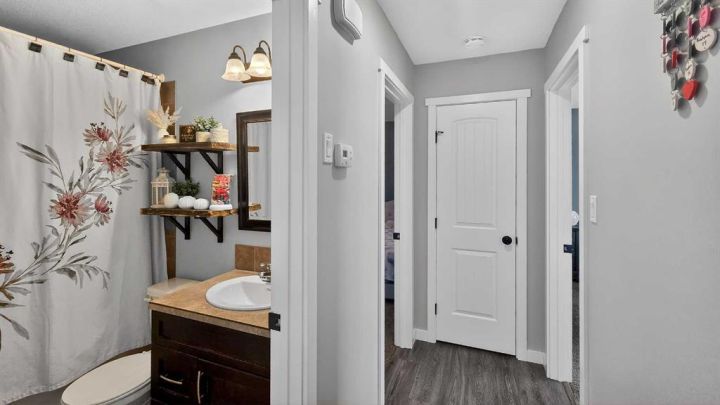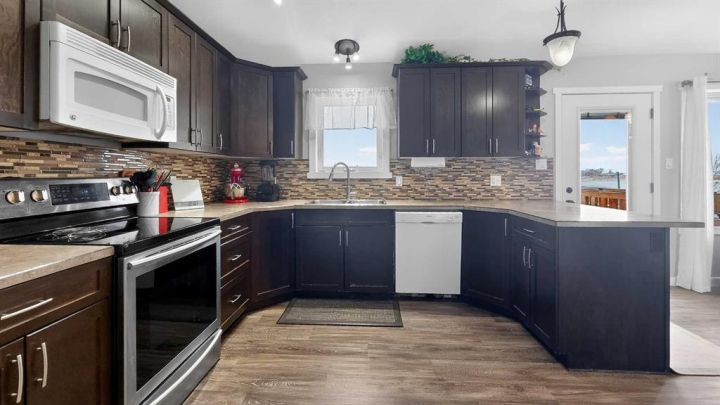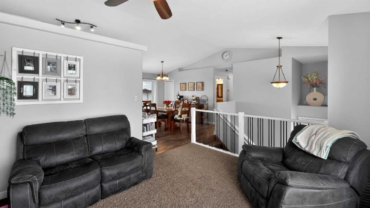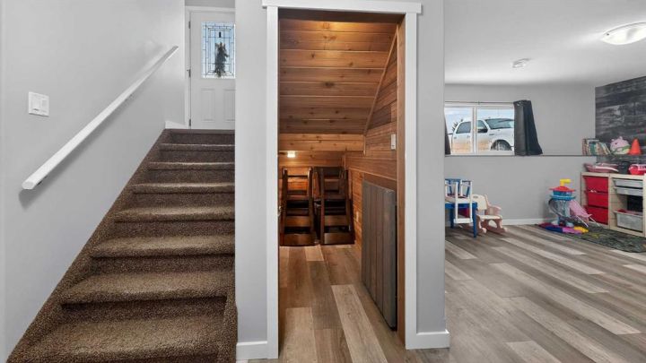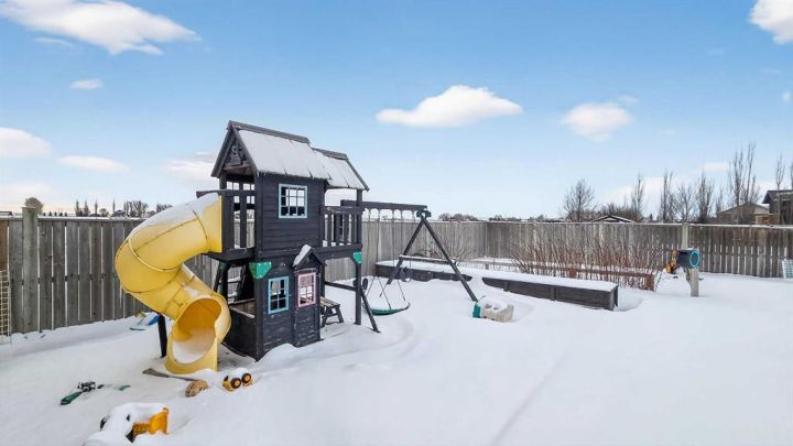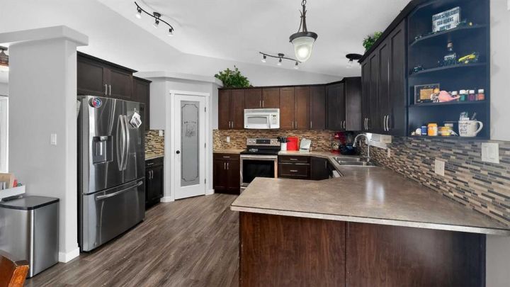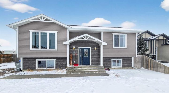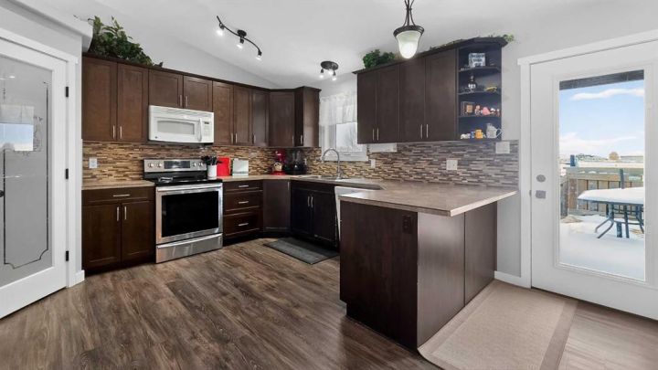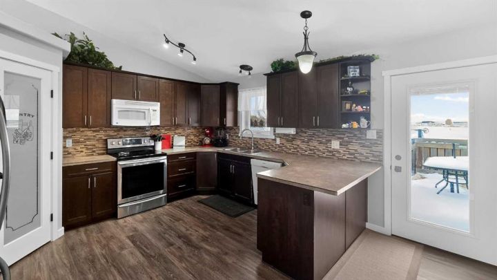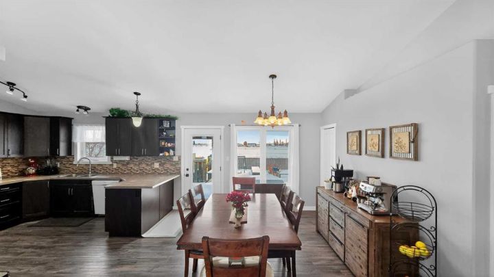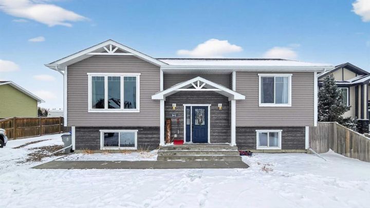 Discover this charming 4-bedroom, 2.5-bathroom home, boasting 1,126 sqft, located in the picturesque town of Barnwell. With easy access to the highway and just a short drive to Taber, this residence offers the perfect blend of convenience and tranquility in a family-friendly community ideal for raising children. This lovely home is set on a spacious lot, providing serene views with no rear neighbors. Step inside to an inviting foyer and ascend to the main level, where you'll find a cozy living room bathed in natural light from a large window. The warm and welcoming kitchen features rich chocolate brown cabinetry, a corner pantry, and comes fully equipped with modern appliances—ready for your culinary creations. Adjacent to the kitchen is the dining area, which comfortably accommodates a six-person table and includes access to the back deck for outdoor entertaining. The main floor also includes a 4-piece bathroom, a versatile bedroom, and a master suite with a walk-in closet and a private 2-piece ensuite. Venturing downstairs, you’ll discover a spacious family/recreation room, two additional bedrooms, a 4-piece bathroom, and a laundry room, along with ample storage options. The expansive backyard is a playground for kids, featuring a sandbox and plenty of room for play. Garden enthusiasts will appreciate the established raspberry plants and dedicated garden space, while a shed provides convenient storage for tools and lawn equipment. To enhance your comfort, this home is equipped with air conditioning—an essential feature for enjoying the warm Southern Alberta summers. Don’t miss out on making this charming property your new home. Contact your favorite real estate agent today to arrange a viewing!